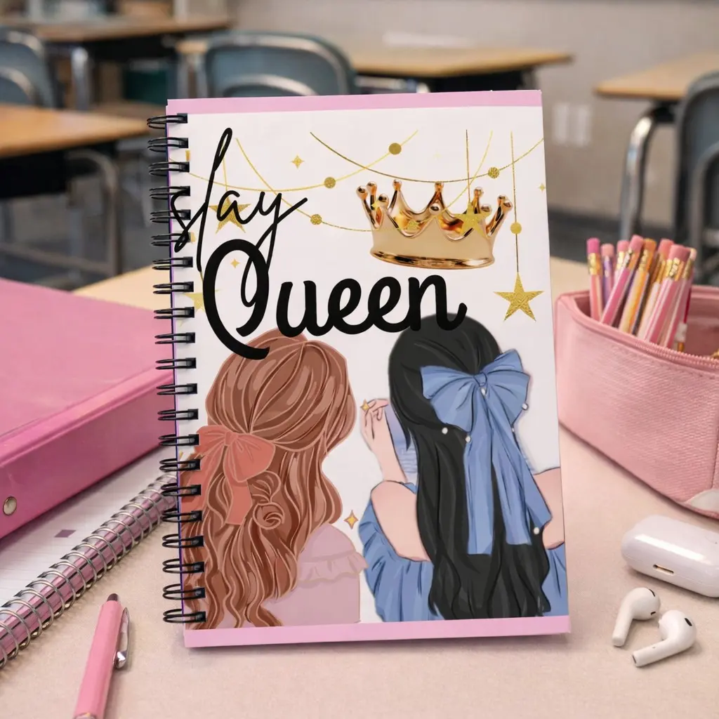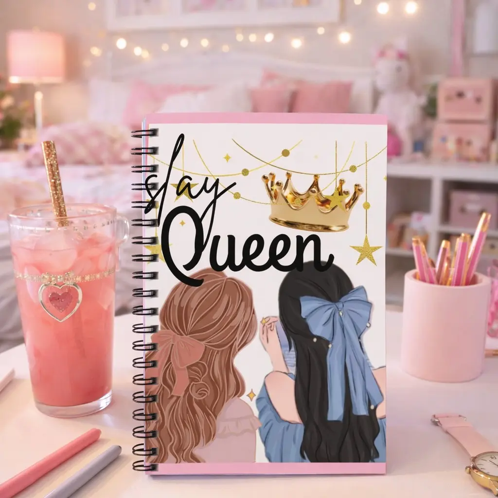 Two friends side-by-side, crowns and twinkling stars overhead—this ruled spiral notebook captures that warm, sisterly bond. Soft pastel pink borders and illustrated hair bows create a gentle, intimate mood where thoughts, plans, and secrets can be recorded. The smooth 90gsm pages take pens and pencils with minimal bleed, while a metal spiral lets the book lie flat for easy journaling. Tuck notes or mementos into the inside document pocket, and carry this compact 6" x 8" book wherever close friendships and creative moments happen.