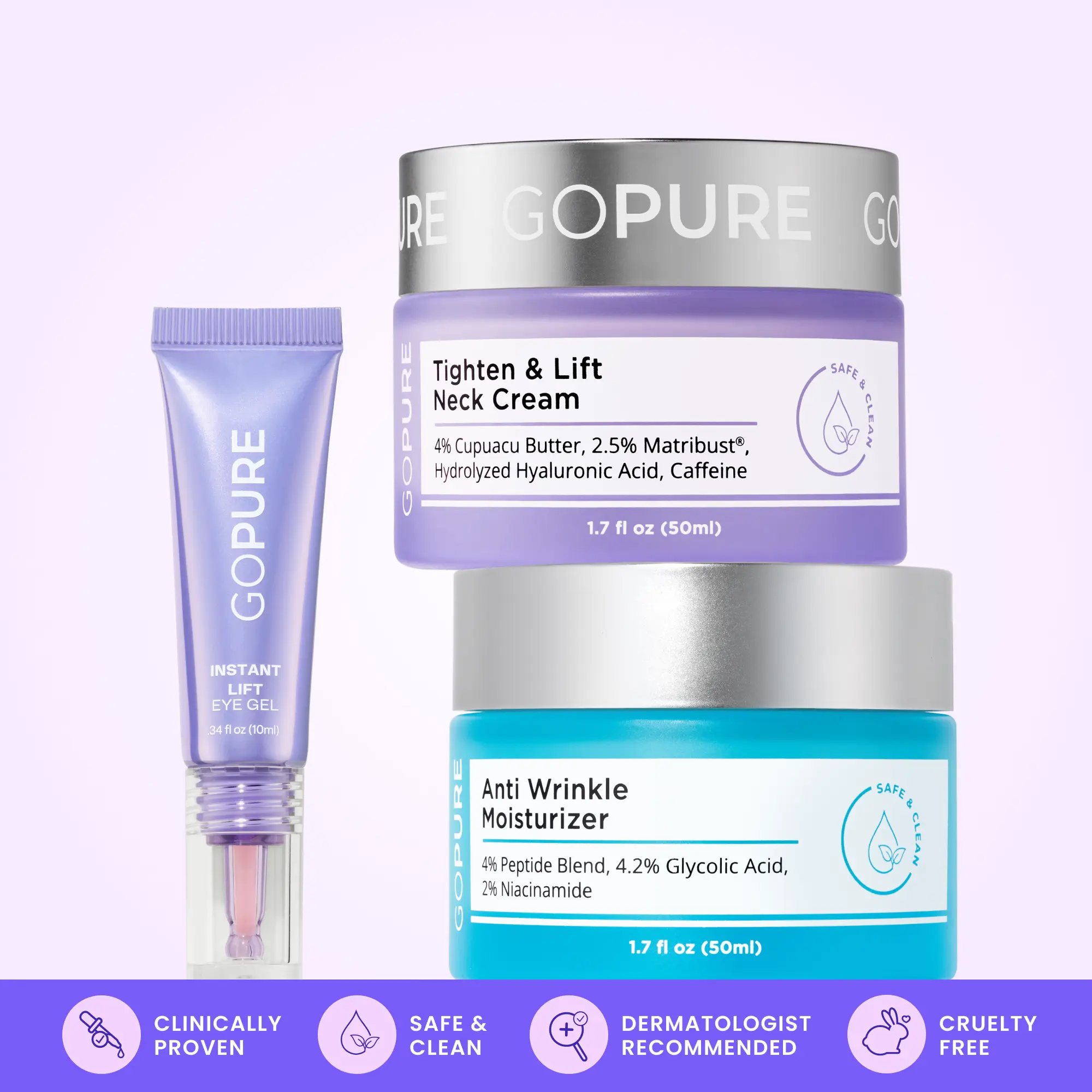 | Ingredients | EYE GEL: Full ingredient list: Water/Aqua/Eau, Camellia Sinensis Leaf Water, 1,2-Hexanediol, Magnesium Aluminum Silicate, Sodium Silicate, Glycerin, Sea Water/Maris Aqua/Eau de mer, Bacillus Ferment Extract Filtrate, Heptapeptide-6, Bacillus Ferment, Castanea Sativa (Chestnut) Seed Extract, Sucrose, Hydrolyzed Algin, Sodium Hyaluronate, Propanediol, Triethyl Citrate, Cellulose Gum, Xanthan Gum, Glyceryl Caprylate, Phenethyl Alcohol, Leuconostoc/Radish Root Ferment Filtrate, Sodium Citrate, Caprylyl Glycol, Iron Oxides (CI 77491),NECK CREAM: Water (Aqua), Aloe Barbadensis Leaf Juice, Diisooctyl Succinate, Theobroma Grandiflorum Seed Butter, Diisopropyl Dimer Dilinoleate, Propanediol, Limnanthes Alba (Meadowfoam) Seed Oil, Hydrogenated Ethylhexyl Olivate, Hydrogenated Olive Oil Unsaponifiables, Caprylic/Capric Triglyceride, Simmondsia Chinensis (Jojoba) Seed Oil, Cetearyl Olivate, Sorbitan Olivate, Cetearyl Alcohol, Cetyl Palmitate, Sorbitan Palmitate, Sorbitan Oleate, Hydrolized Hyaluronic Acid, Piperonyl Glucose, Glycerin, Lecithin, Caffeine, Palmitoyl Carnitine, Hydrolyzed Plukenetia Volubilis Seed Extract, Geranium Maculatum Extract , Equisetum Arvense Extract , Hamamelis Virginiana (Witch Hazel) Bark/Leaf/Twig Extract, Taraxacum Officinale (Dandelion) Extract, Propolis Extract, Camellia Sinensis Leaf Extract, Centella Asiatica Extract, Oryza Sativa (Rice) Bran Extract, Rosmarinus Officinalis (Rosemary) Leaf Extract, Helianthus Annuus (Sunflower) Seed Extract, Tocopherol, Simmondsia Chinensis (Jojoba) Seed Extract, Tamarindus Indica Seed Polysaccharide, Lavandula Angustifolia (Lavender) Oil, Citric Acid, Sclerotium Gum, Potassium Sorbate, Sodium Benzoate, 1,2-Hexanediol, Caprylyl Glycol, Lonicera Caprifolium (Honeysuckle) Flower Extract, Lonicera Japonica (Honeysuckle) Flower Extract,ANTI WRINKLE MOISTURIZER: Water (Aqua), Aloe Barbadensis Leaf Juice, Dicapryl Succinate, Diisopropyl Dimer Dilinoleate, Propanediol, Potassium Olivoyl Hydrolyzed Oat Protein, Stearyl Alcohol, Butyrospermum Parkii (Shea) Butter, Simmondsia Chinensis (Jojoba) Seed Oil, Glycolic Acid, Niacinamide, Caprylic/Capric Triglyceride, Cetearyl Alcohol, Glyceryl Oleate, Glyceryl Stearate, Sodium Hydroxide, Tamarindus Indica Seed Polysaccharide, Lavandula Angustifolia (Lavender) Oil, Oryza Sativa (Rice) Bran Extract, Rosmarinus Officinalis (Rosemary) Leaf Extract, Heliantus Annuus (Sunflower) Seed Extract, Tocopherol, Glycerin, Geranium Maculatum Stem/Leaf/Flower Extract, Equisetum Arvense Extract Hamamelis Virginiana (Witch Hazel) Bark/Leaf/Twig Extract, Taraxacum Officinale (Dandelion) Extract, Propolis Extract, C12-15 Alkyl Benzoate, Tribehenin, Ceramide NG, PEG-10 Phytosterol, Palmitoyl Hexapeptide-12, Hydroxypropyl Cyclodextrin, Palmitoyl Tripeptide-38, Camellia Sinensis Leaf Extract, Centella Asiatica Extract, Sclerotium Gum, Citric Acid, Sodium Benzoate, Potassium Sorbate Lonicera Caprifolium (Honeysuckle) Flower Extract, Lonicera Japonica (Honeysuckle) Flower Extract |