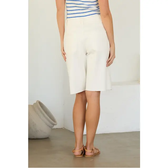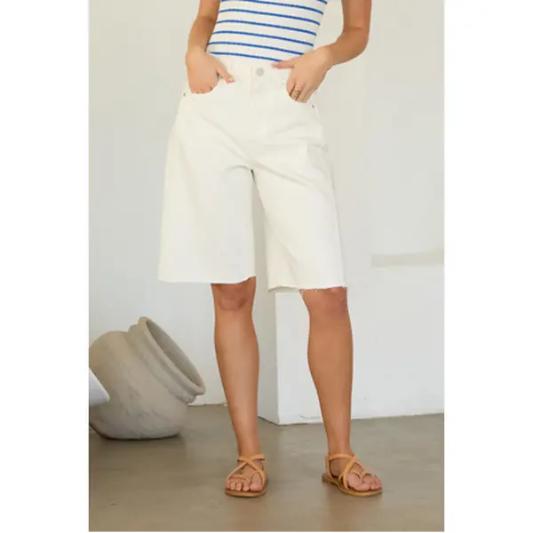 These high-waisted denim Bermuda shorts feature a relaxed, straight-leg silhouette for an effortless, modern fit. Crafted from sturdy yet comfortable cotton denim, they hit just above the knee for a flattering length that's easy to dress up or down. Finished with classic five-pocket styling and a clean hem, this everyday essential pairs seamlessly with knits, tanks, and button-downs for warm-weather wear.