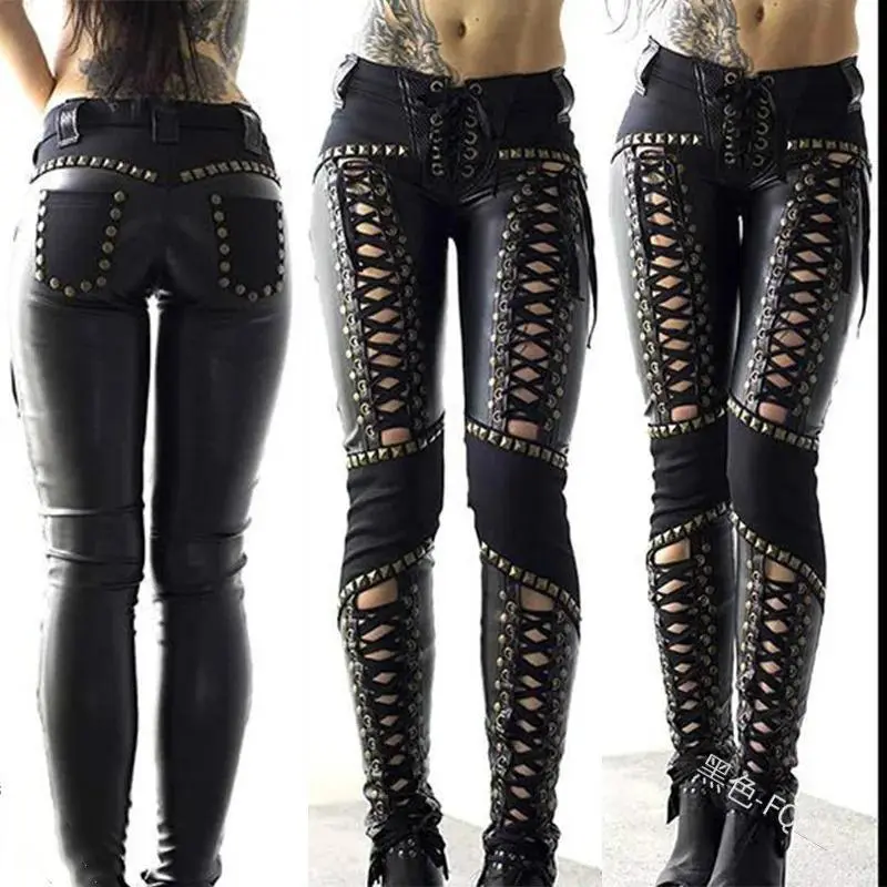 Women's Punk Rock Imitation Leather Pencil Pants - Black Basic Slimming Hollow Bandage Tights Street Bottom Pants (Gift)RAIMENTRY