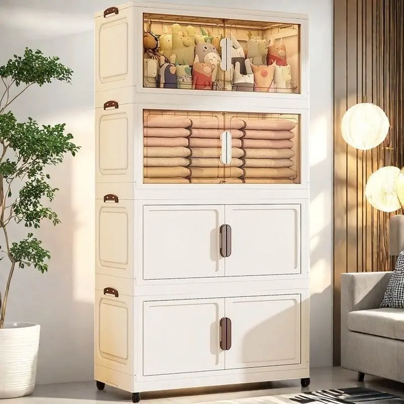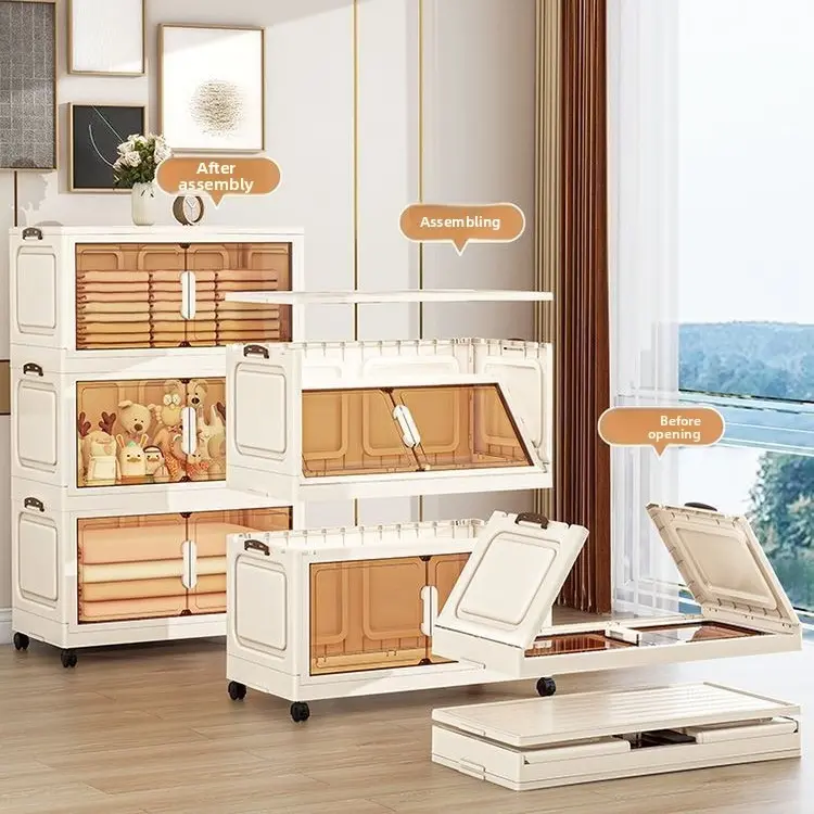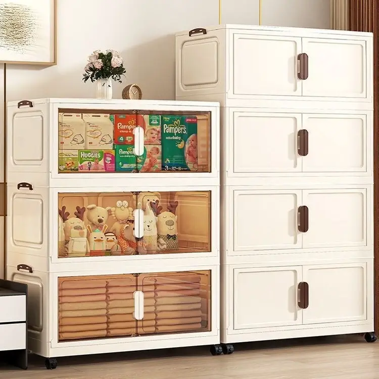 Foldable plastic storage cabinet with doors and wheels, suitable for large-capacity stacked storage in bedrooms, living rooms, and kitchens—high-quality, space-saving design, easy to assemble, magnetic closure, transparent doors