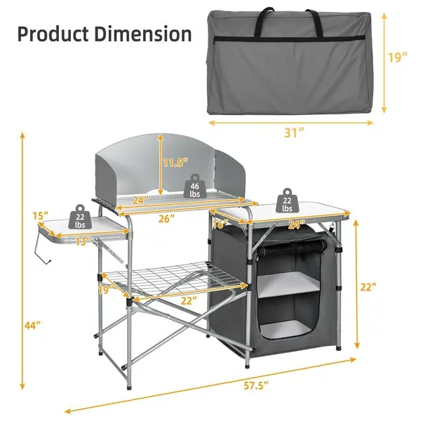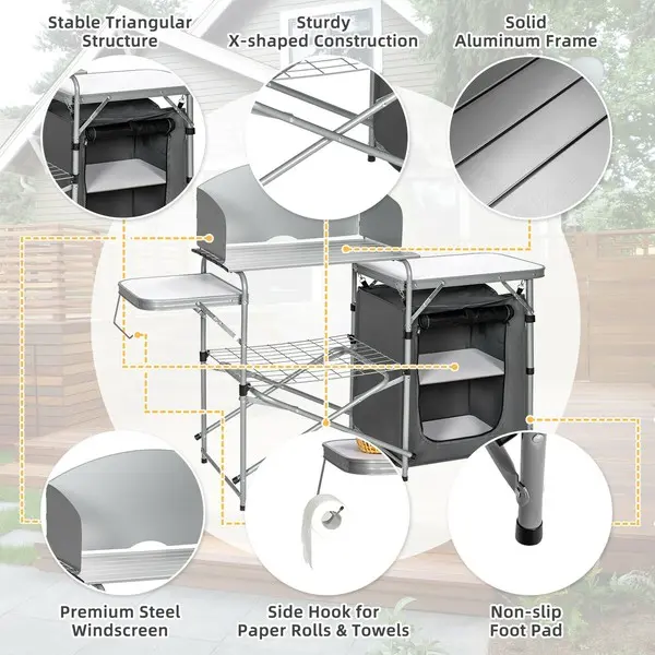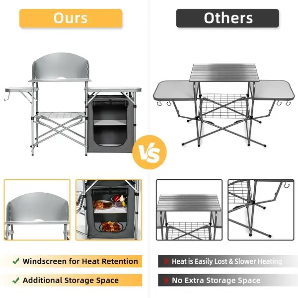 • Large Storage Space: Large top surface area, two side tables, lower shelf and zippered bag with two shelves of this outdoor table offer enough space for all of your cooking gear and it's ideal for storing supplies and condiments. And the convenient carry bag for you saves valuable storage space at home.