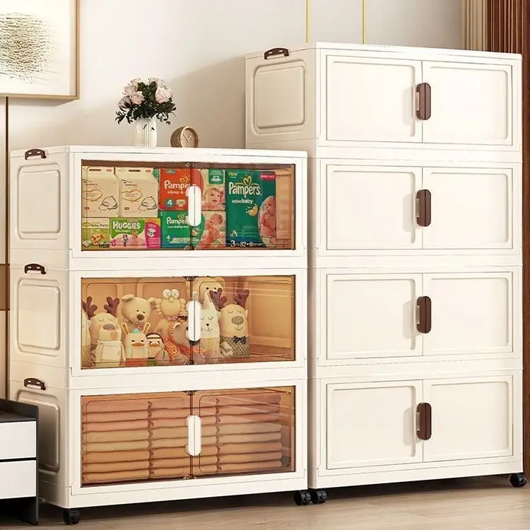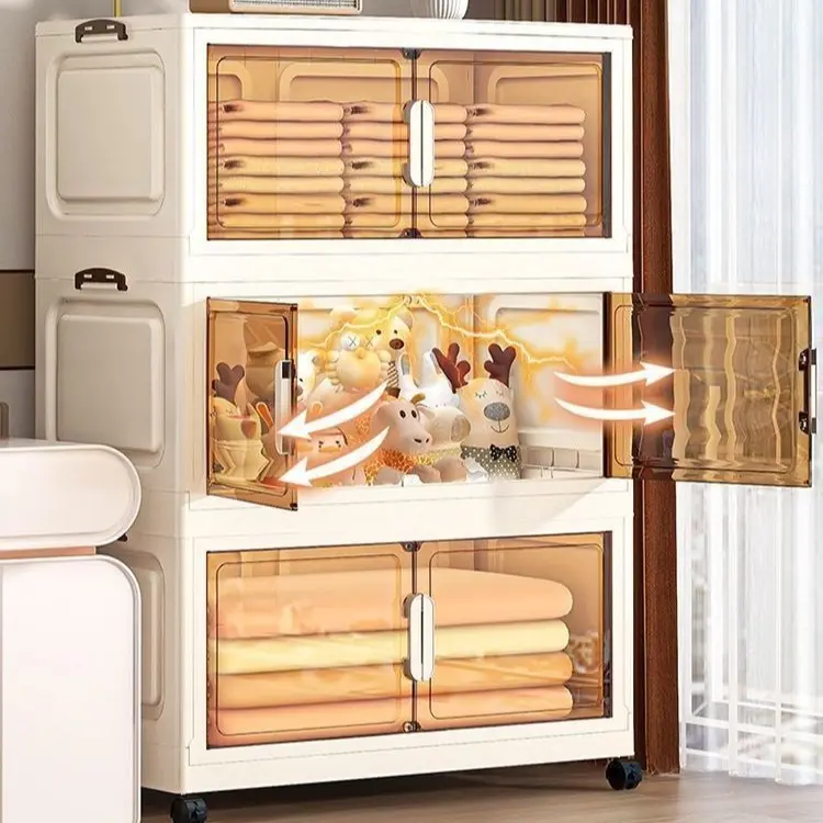 Collapsible storage drawers with clear doors and rolling casters, ideal for multi-layer space-saving organization in bedrooms, closets, and playrooms - durable, stackable construction, simple to install, magnetic door seals, flexible movement, multifunctional storage solution.