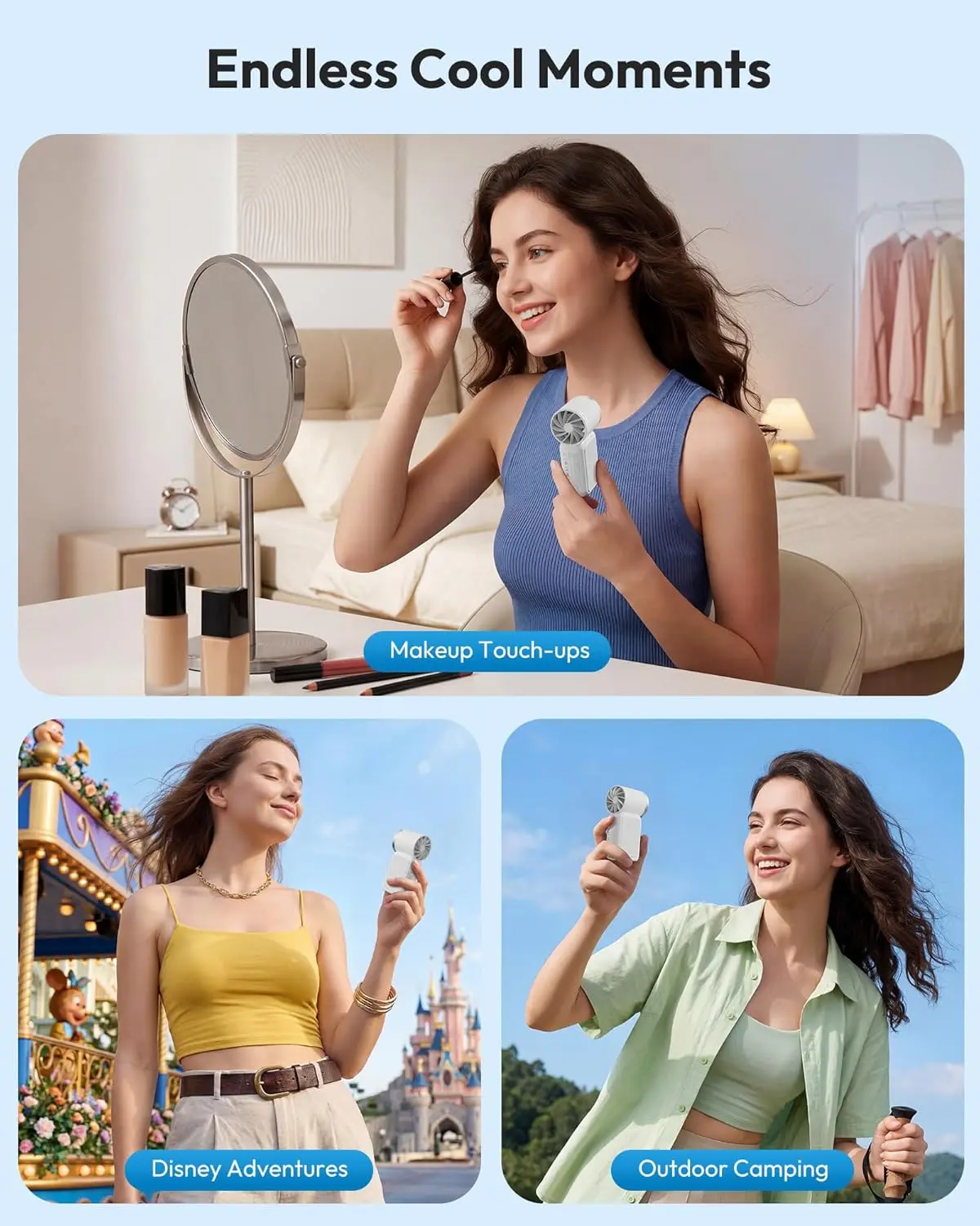 ·Makeup-Friendly & Skin-Comfortable Personal Fan:** The gentle yet effective airflow cools your face and neck while helping to keep your makeup perfectly intact—ensuring you stay cool without smudging your look. Whether you're engaging in outdoor activities, going on a date, working out, or simply looking to beat the heat in style, this mini fan is an absolute must-have.