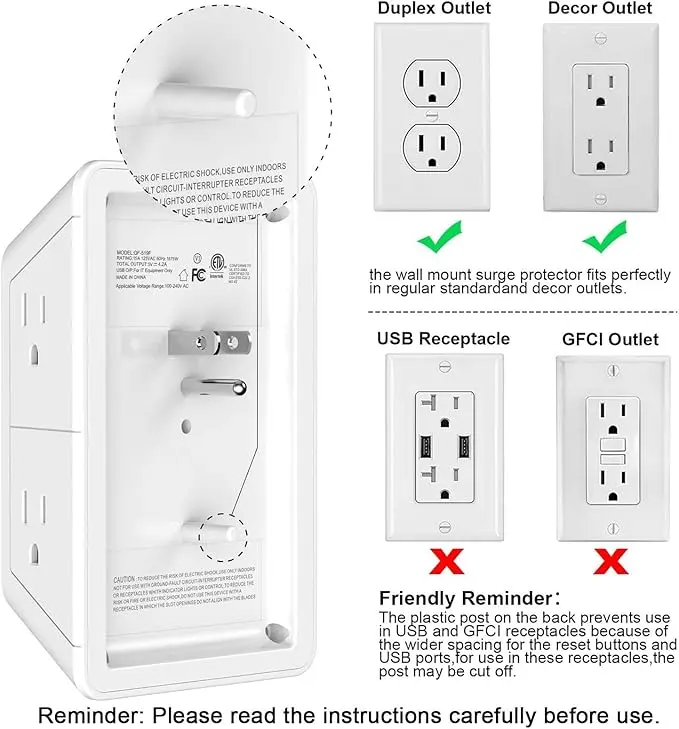 ·Wall Mountable Design: Just plug the surge protector into a standard grounded duplex wall receptacle and if you want secure it on duplex outlet just need a screw driver to use the screw included then you don't need worry about falling off.