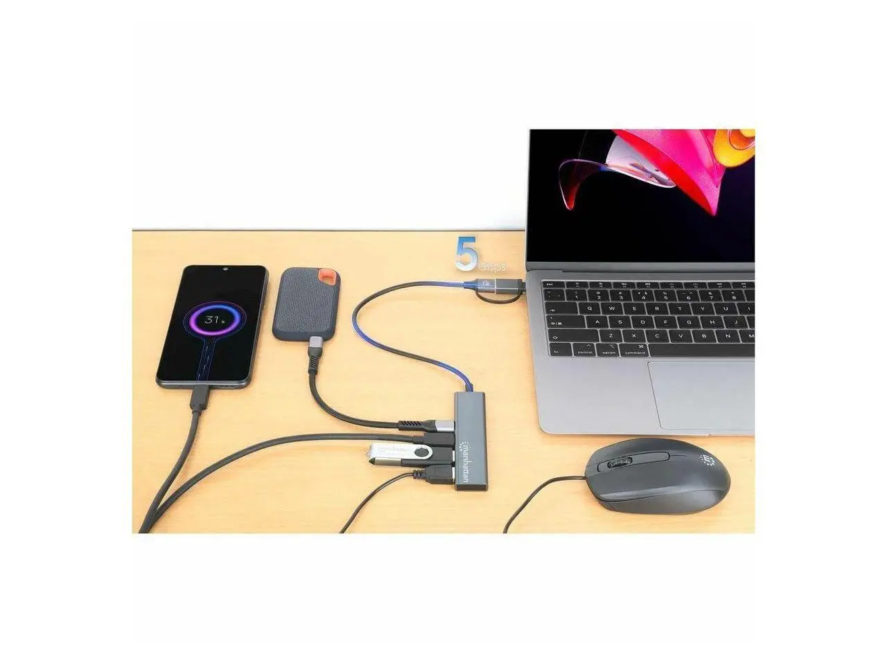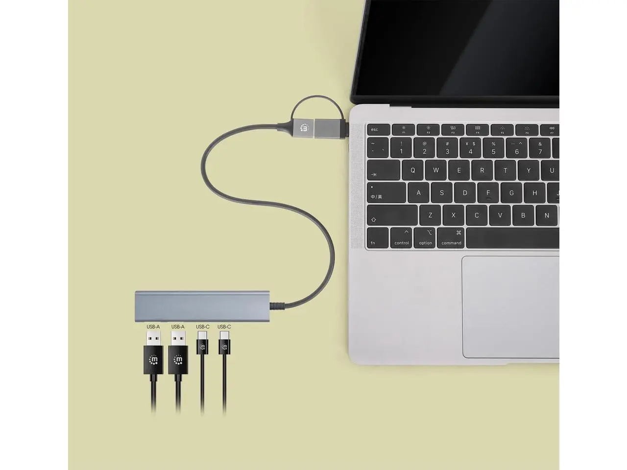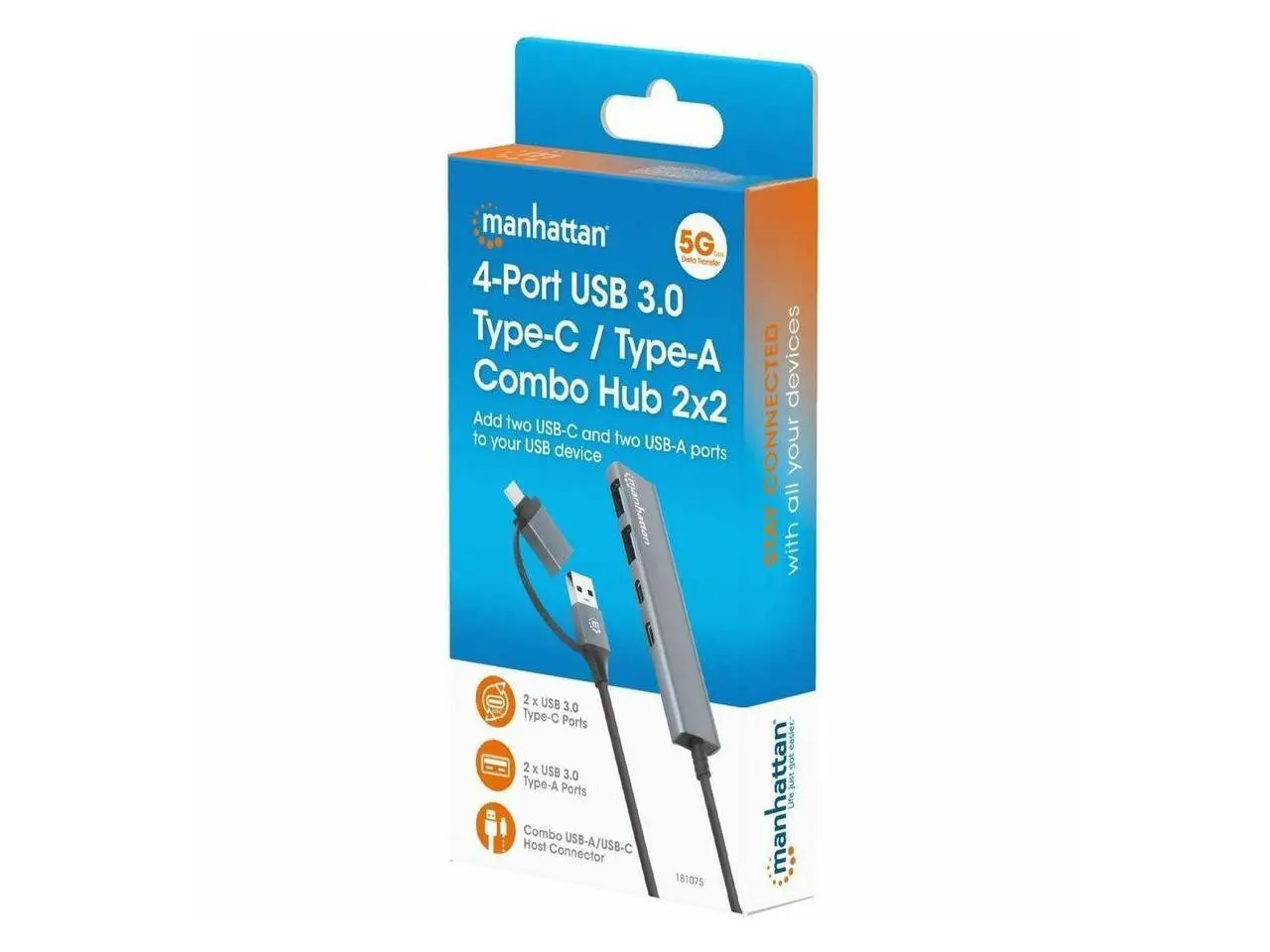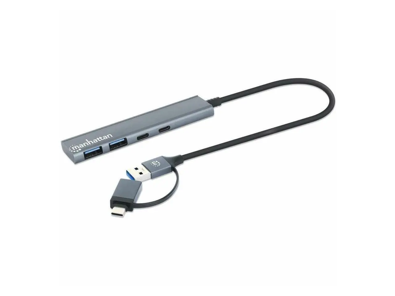 : More Ways to Connect Your USB-A and USB-C DevicesThe Manhattan 4-Port USB 3.0 Type-C / Type-A Combo Hub expands one of your device's USB ports into two USB-A ports and two USB-C ports, so you can easily connect a keyboard, mouse, flash drive or phone. Devices that support the USB 3.2 Gen 1 spec (formerly known as USB 3.0 ) can reach transfer speeds up to 5 Gbps for external storage, printing and more. The Hub's SuperSpeed ports are backward compatible with USB versions 2.0 or even 1.1. You can also charge your phone or tablet since the Hub supplies up to 5 V / 0.9 A of power. Versatile 2-in-1 USB-A and USB-C connection for many operating systemsThis hub has a built-in USB-A cable with an attached USB-C adapter plug for enhanced connectivity to more devices. Thanks to this versatile combination, you can connect this hub to a maximum variety of USB host devices. Pick the connector that works with your PC, laptop, tablet, MacBook (r), Chromebook (tm) and Surface (r), and plug right in. Sleek aluminum housing and bus power for connectivity you can take with youThis USB hub's durable case, compact size and bus power mean greater portability for you when you have to pack up and go.