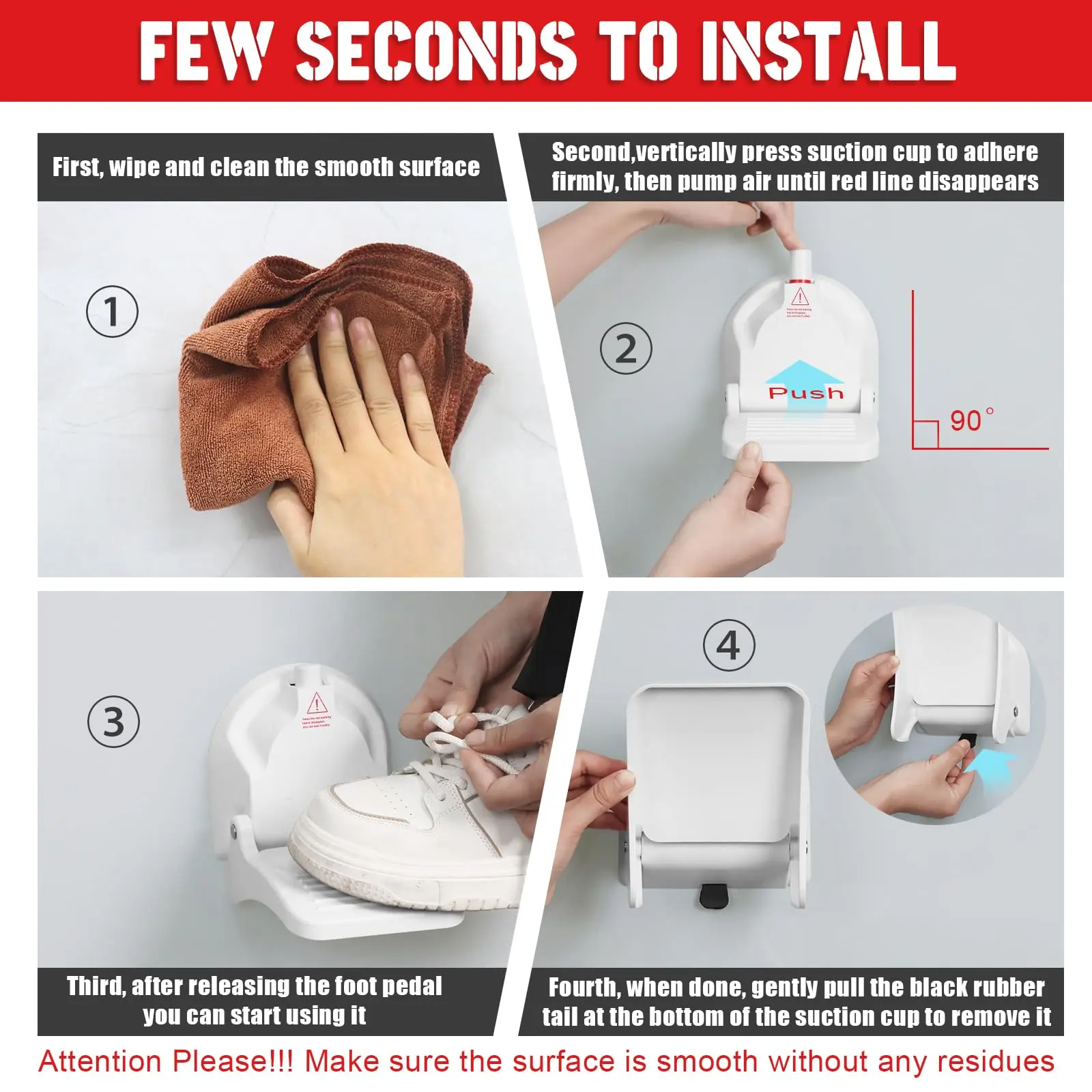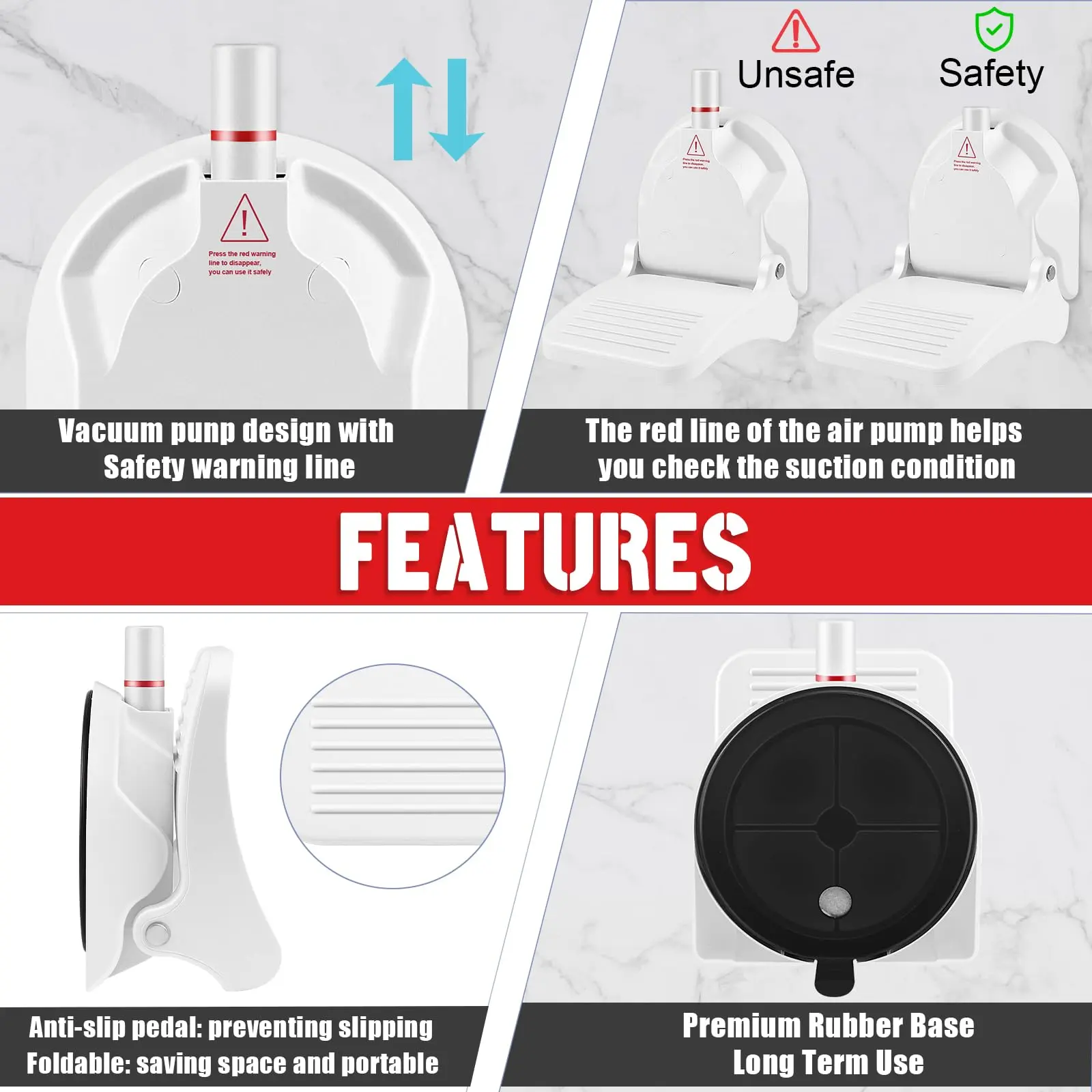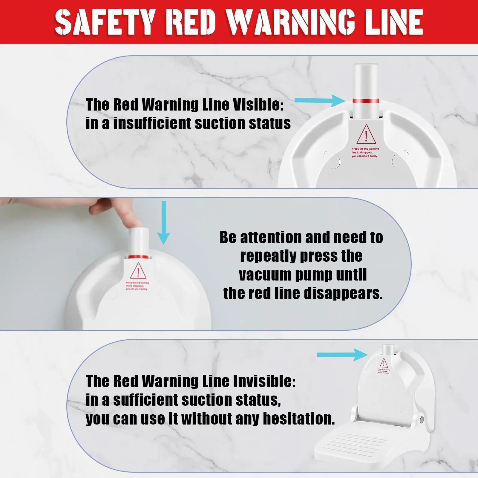 ·Vacuum Pump Design with No Drilling: No tools required to install, just suctioned the foot rest to the shower wall by pressing the valve down until the red line is no longer visible. The red warning line would let you know if the suction cup secure enough.