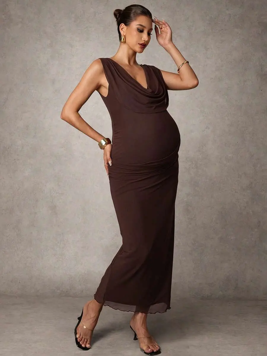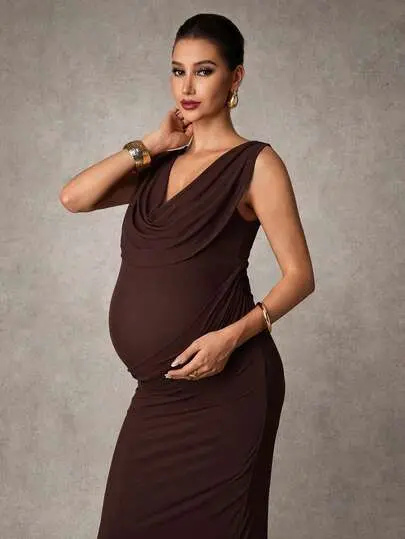 BELLAdresses Maternity Clothes Maternity Dress Summer Pregnant Clothes Brown Dress Sleeveless Dress With A Draped Neck Elegant Party
