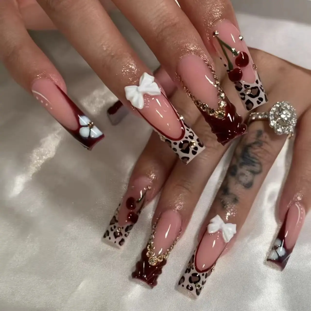 New Fashion Square Leopard Print Cherry Nail Tips, Nude Base with Wine Leopard Edge, Glitter Butterfly Design, Detachable False Nails