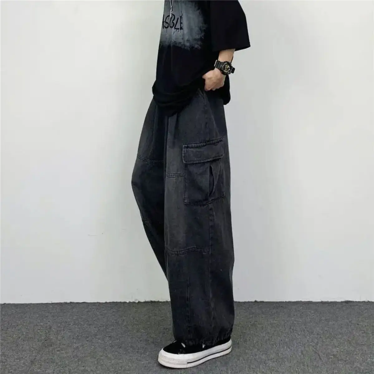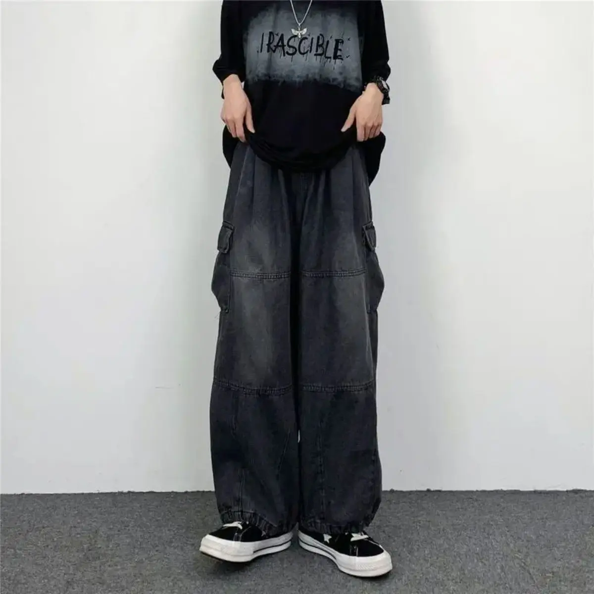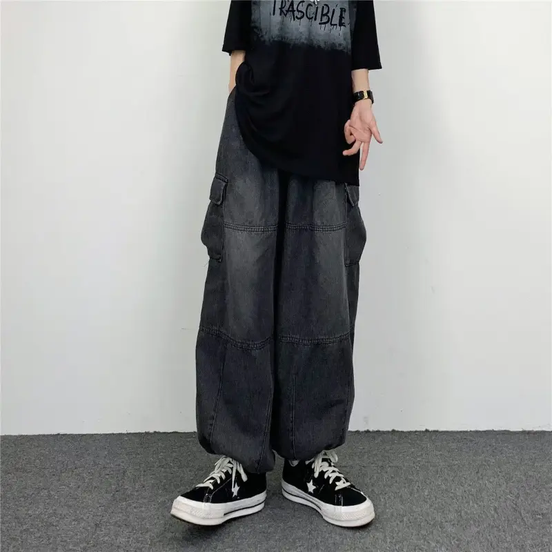 These dark gray parachute cargo pants for men highlight a trendy streetwear style with a loose, relaxed fit that ensures all-day comfort and free movement. Designed with an adjustable drawstring hem, they allow you to customize the fit for different casual looks, while the classic cargo pocket design adds practicality and visual layers. Ideal for daily street styling, city outings, weekend gatherings, light outdoor activities, travel and everyday casual wear, they easily pair with T-shirts, hoodies, jackets and sneakers for a simple yet fashionable urban look.Material: High-quality