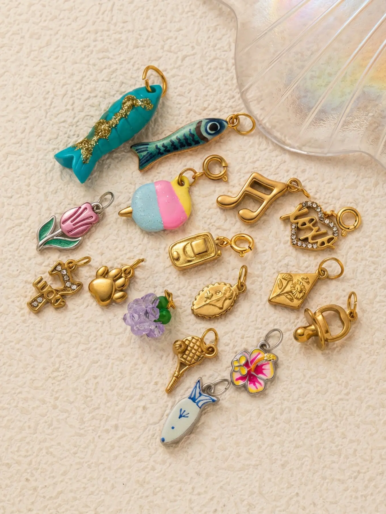 1PC Fashion Simple Bohemian Style Pendant, Love Dog Claw, Racet, Music Note, Flower, Cotton Candy, Fish, Pendant, Stainless Steel Plated 18K Gold, Suitable for DIY Fashion Accessories of Keychains, Bags, Jewelry