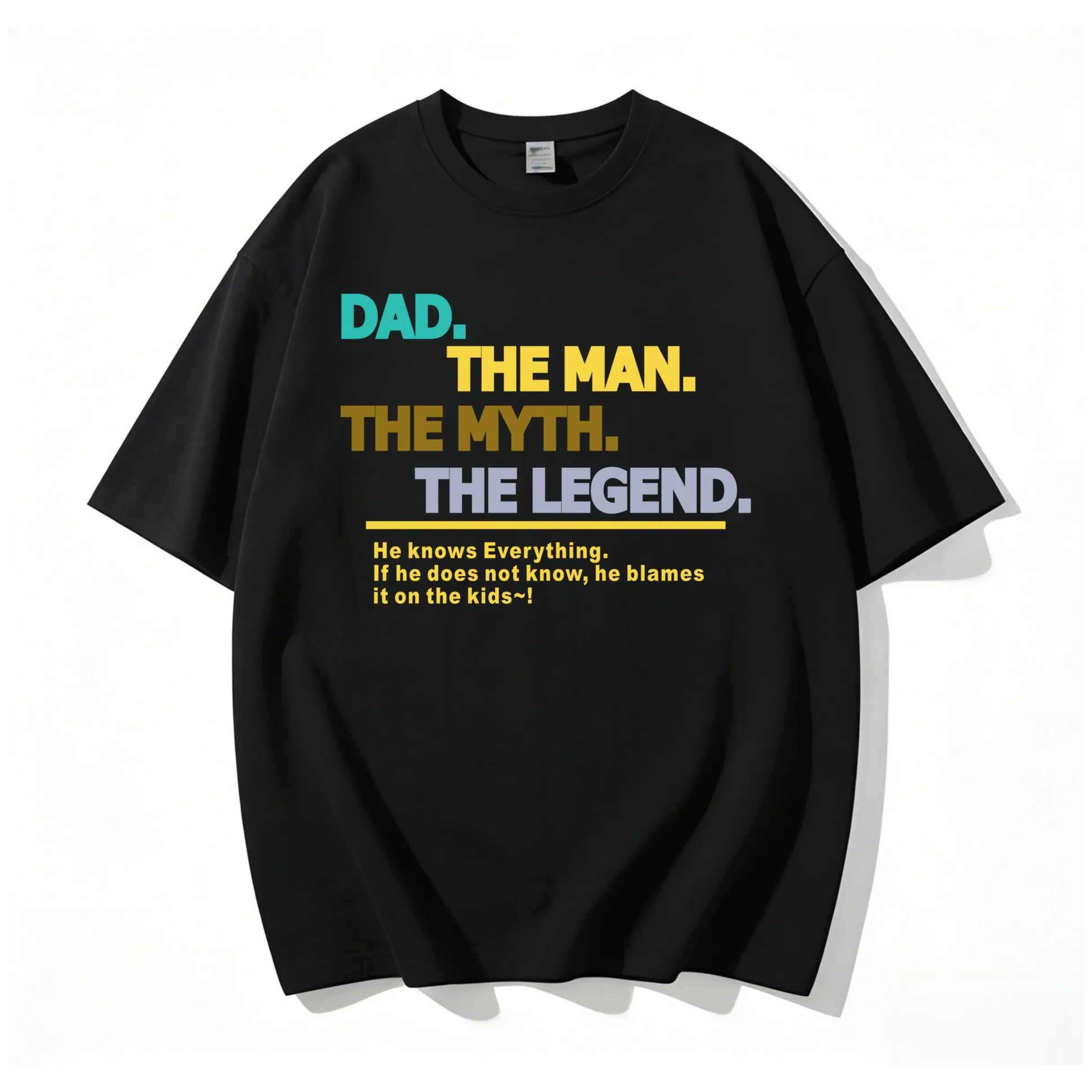 ·He knows Everything. If he does not know, he blames it on the kids~! : The hilarious, universally relatable punchline that every single kid in America will instantly recognize. We’ve all lived this joke: dad swears he knows the answer to every question, and when he doesn’t? He playfully blames it on the kids. It’s the inside joke that every family shares, the kind of line that will make your dad laugh out loud, and get endless nods and laughs from every other dad who sees it. It’s funny, warm, and 100% authentic — no cringey, over-the-top gags, just the real, beloved dad life we all know.