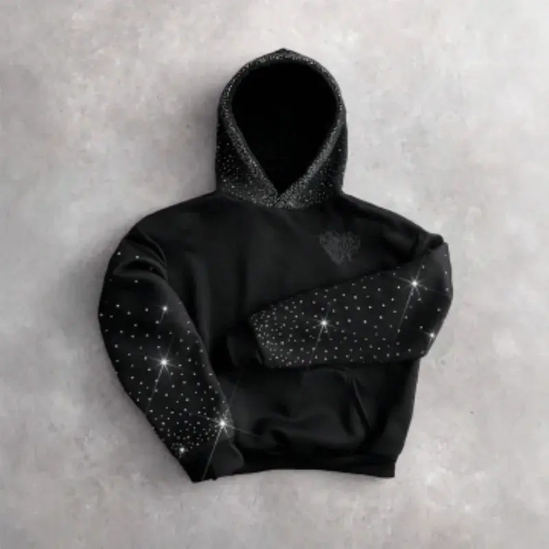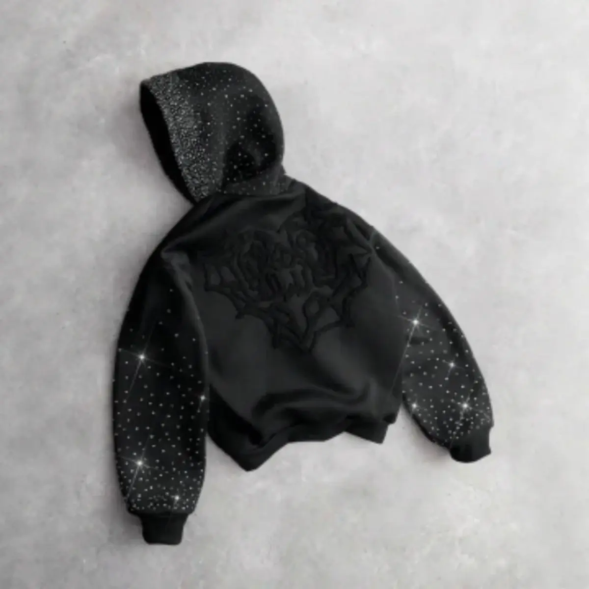 This unisex pullover hoodie is designed for fall Y2K streetwear, adorned with dazzling rhinestone embellishments and intricate Gothic embroidery on the sleeves and hood, creating a bold, sparkling, and darkly stylish look. Made with soft, comfortable fabric and a relaxed fit, it combines eye-catching detailing with everyday wearability, perfect for street fashion, casual outings, parties, and personal styling. The glittering rhinestones and Gothic patterns blend retro Y2K glamour with edgy street attitude, making it easy to pair with jeans, cargo pants, or skirts for a standout, high-fashion look for both men and women.Material: High-quality