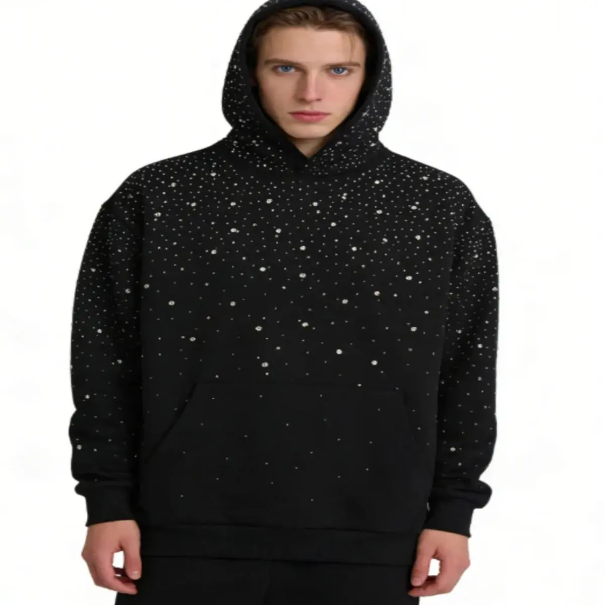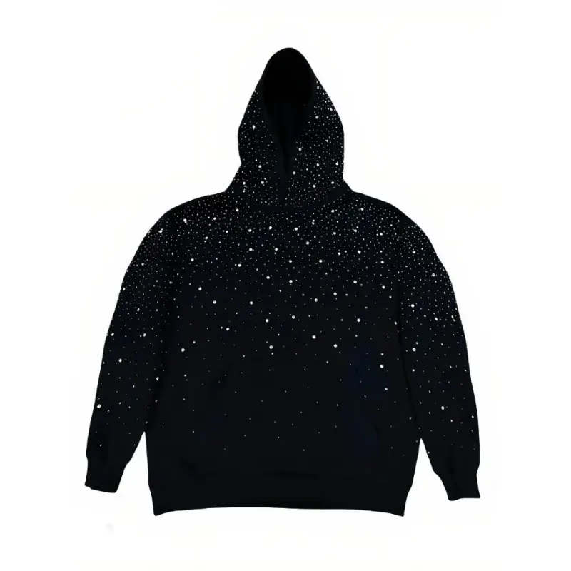 This unisex pullover hoodie features dazzling rhinestone studded detailing and a shimmering starry print design, perfectly capturing the bold punk aesthetic for fall wear. Crafted with soft, comfortable fabric and a relaxed fit, it blends eye-catching sparkle with everyday comfort, ideal for street fashion, casual outings, music events and personal styling. The sparkling rhinestones and starry pattern create a striking, edgy look that embodies Y2K and punk vibes, easily paired with jeans, cargo pants, skirts and boots to achieve a cool, glamorous and distinctive style for both women and men.Material: High-quality