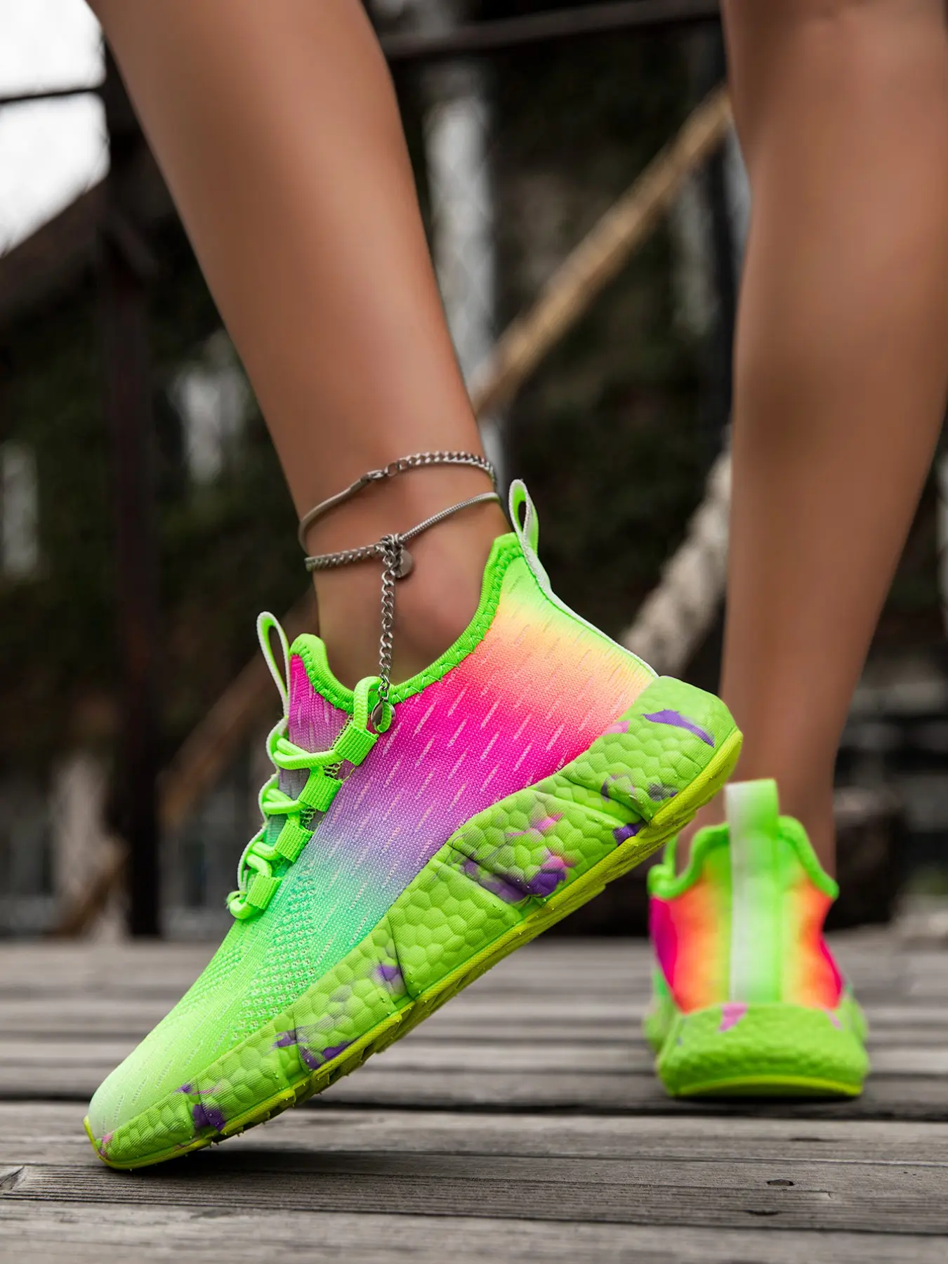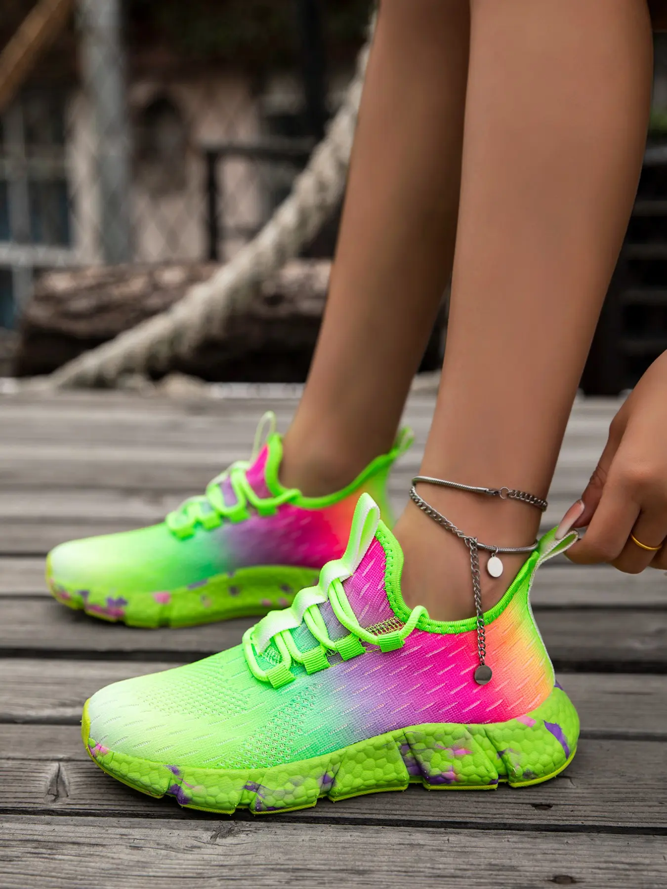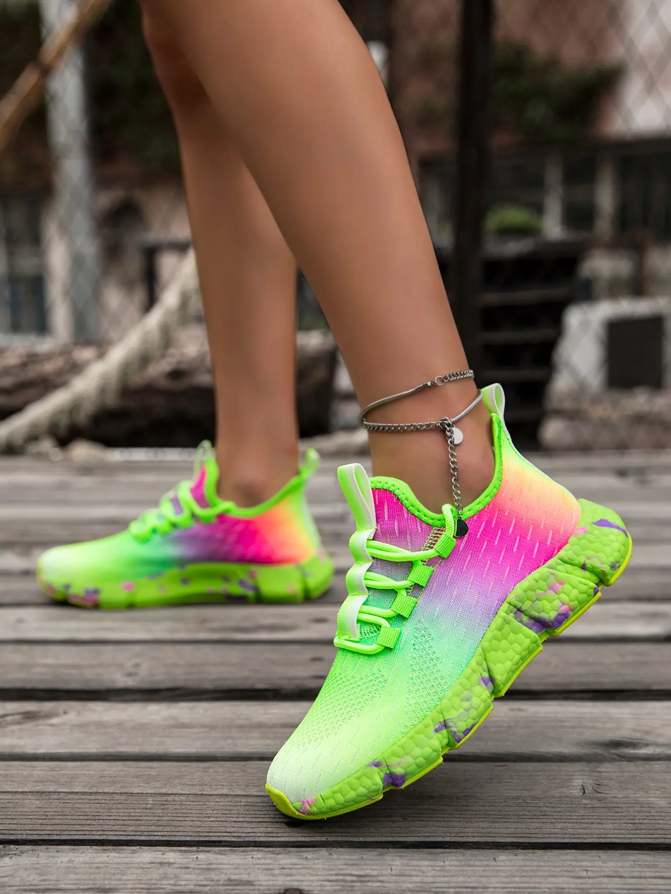 Women's Fluorescent Gradient Mesh Running Shoes, Breathable Flyknit Sneakers, Soft Sole, All-Season Fashion Footwear