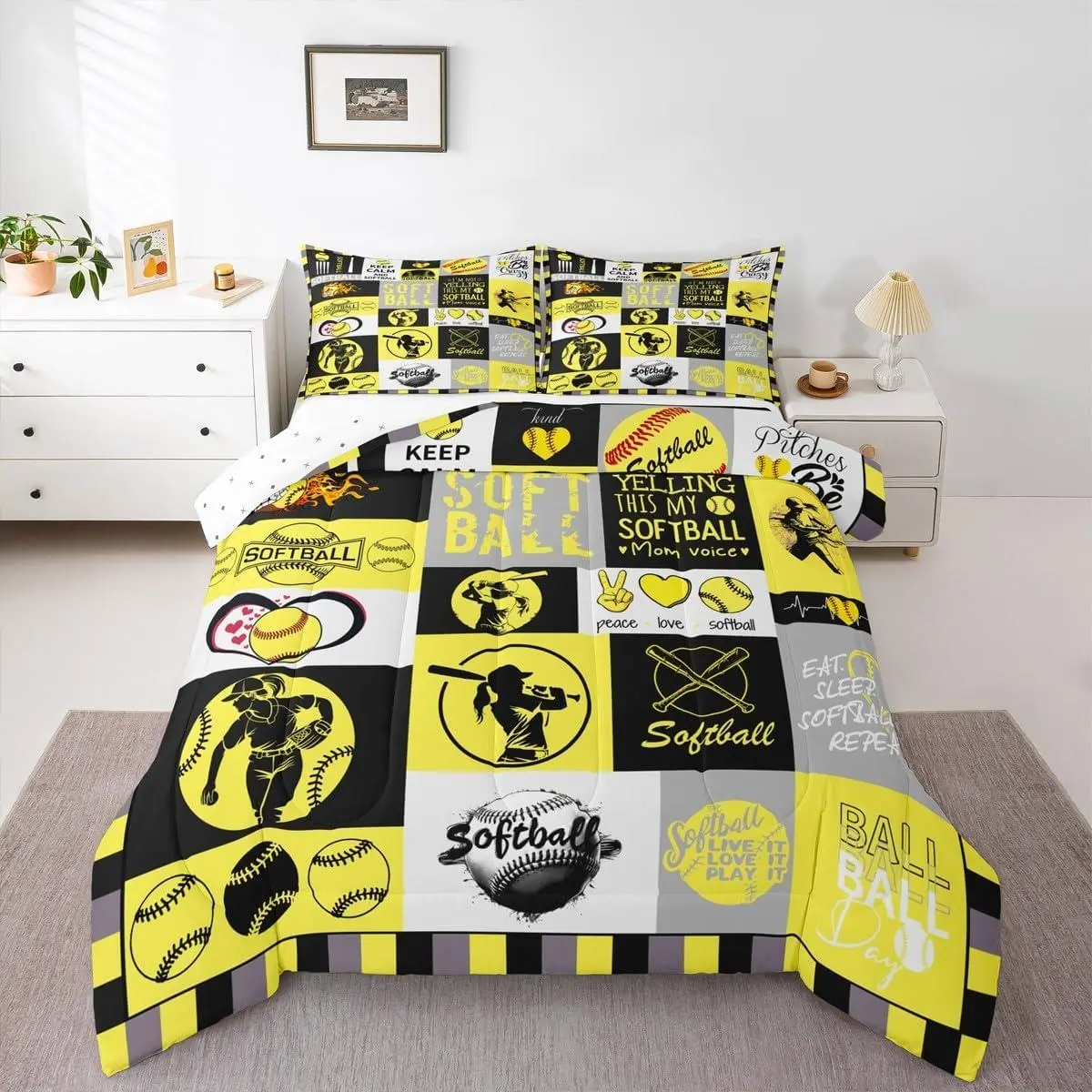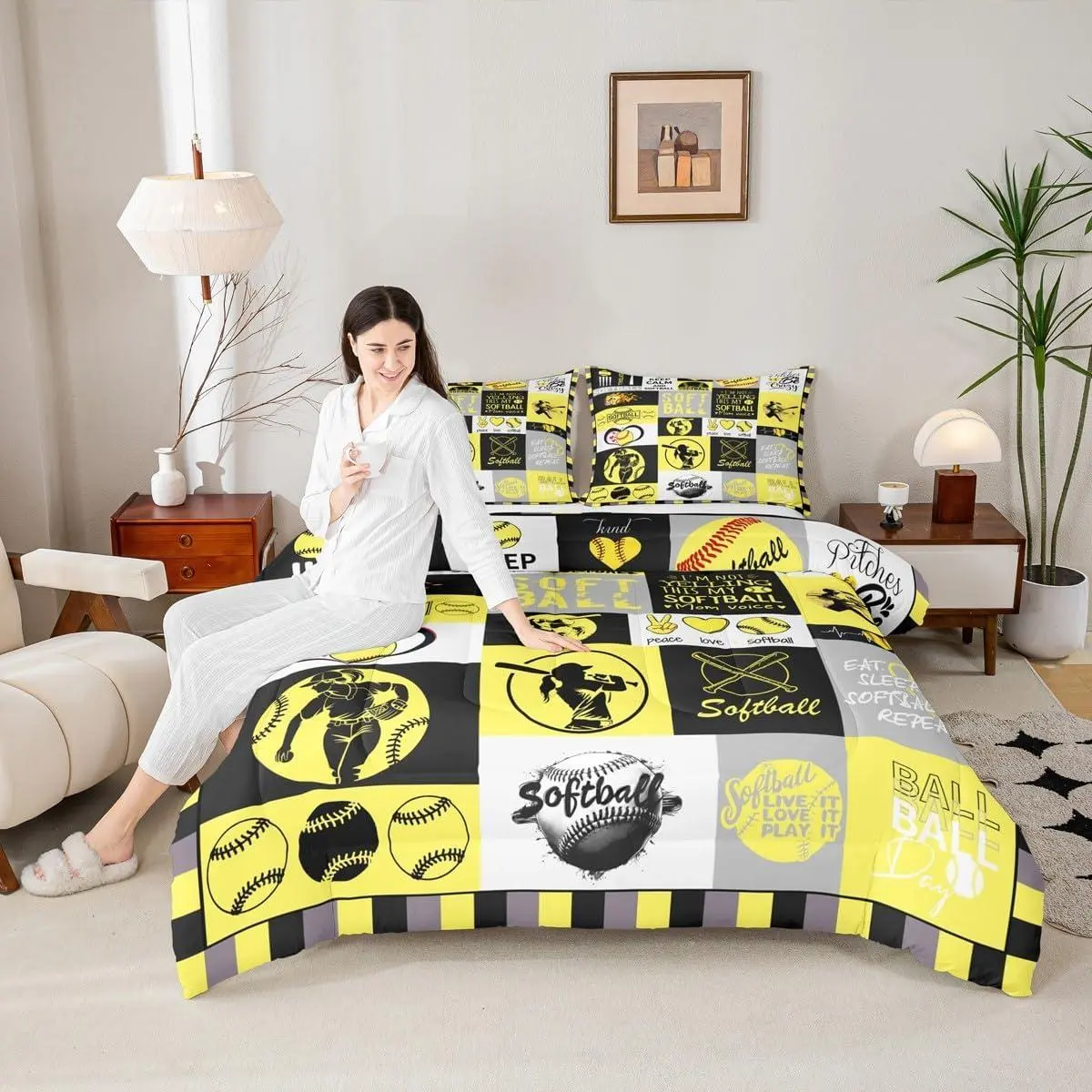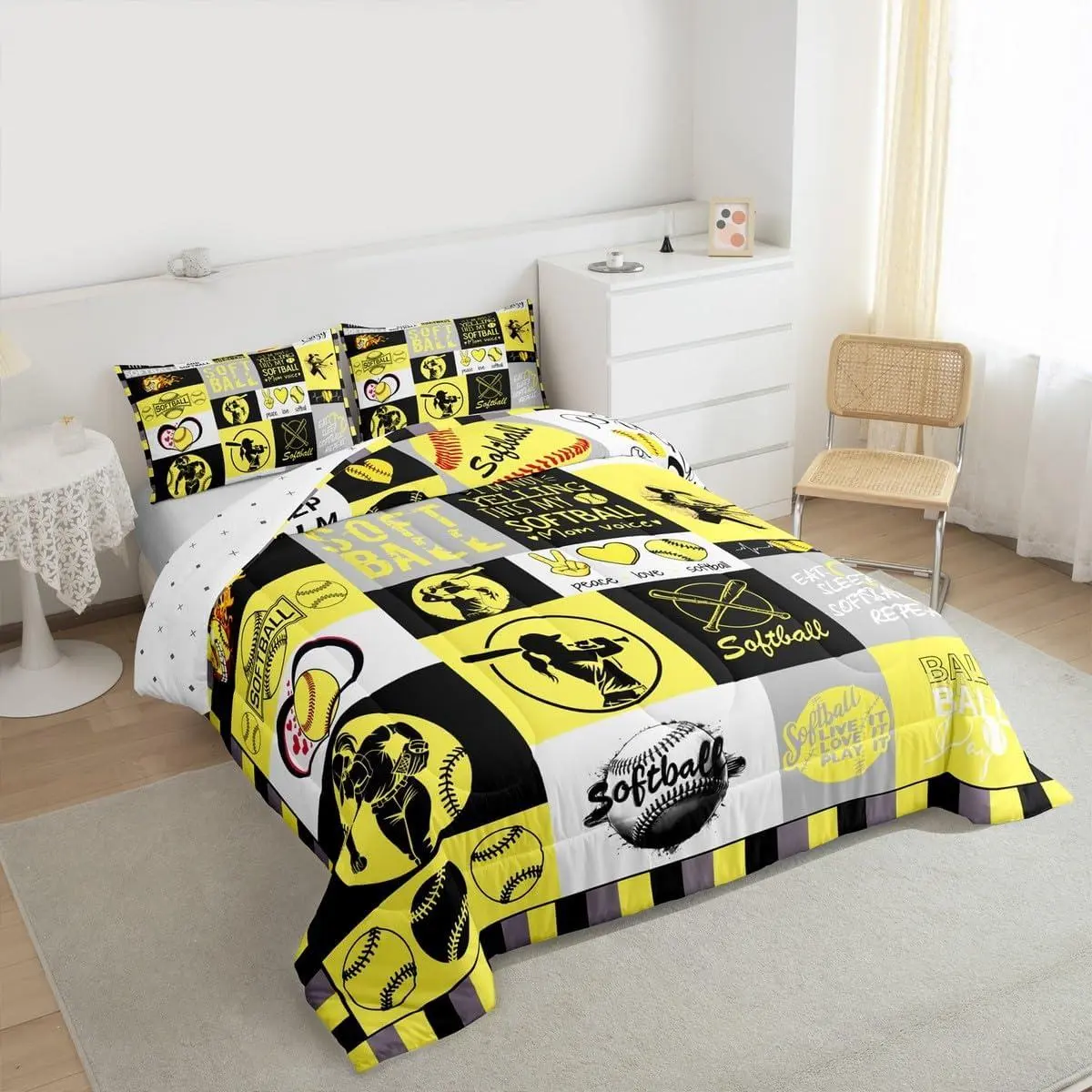 5. Softball Comforter Sets Bedding Set,Kids Girls Women Adults Yellow and Black Grid Comforter Sports Softball Quilted Duvet Set,Bedroom Collection