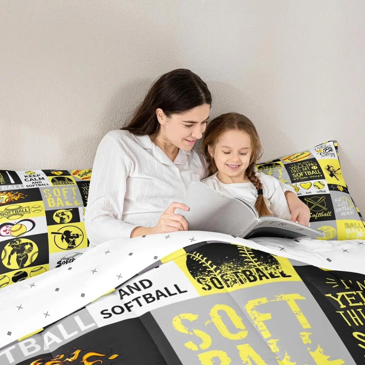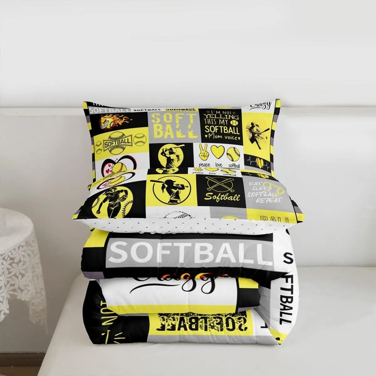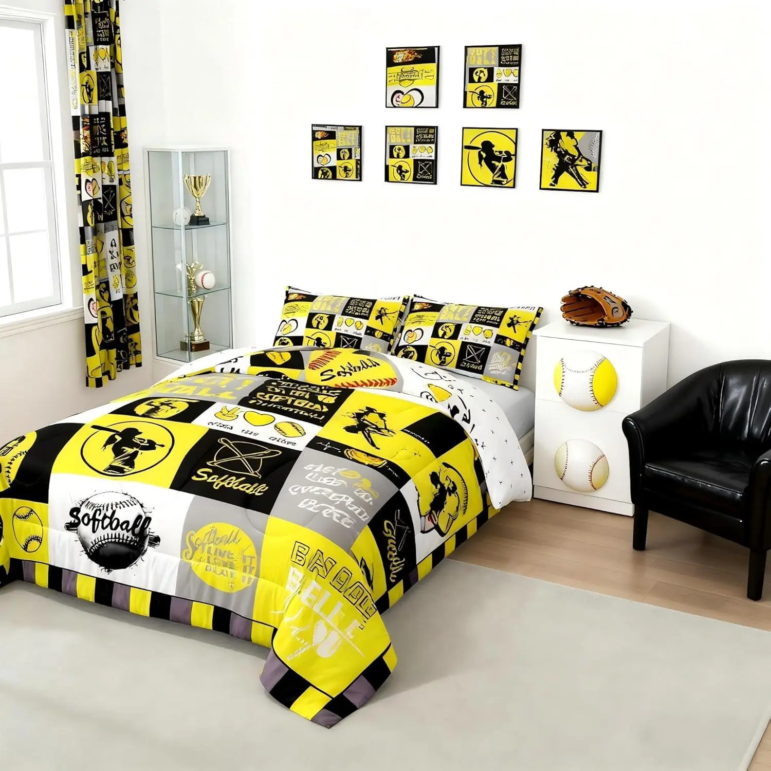 5. Softball Comforter Sets Bedding Set,Kids Girls Women Adults Yellow and Black Grid Comforter Sports Softball Quilted Duvet Set,Bedroom Collection