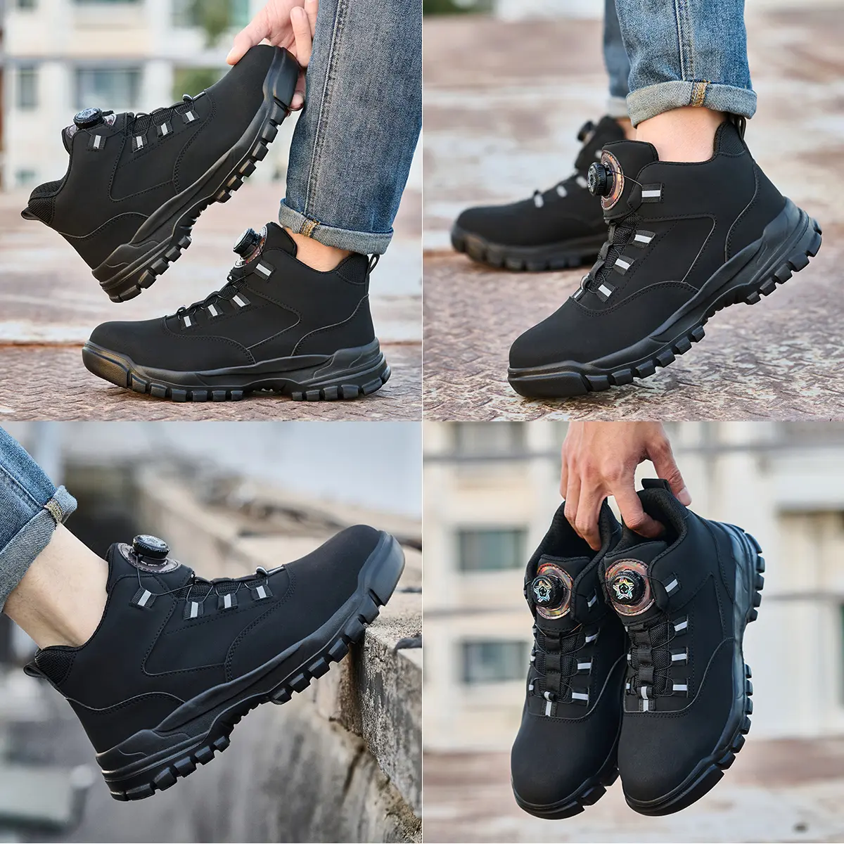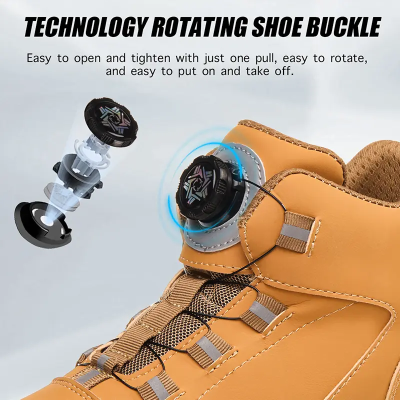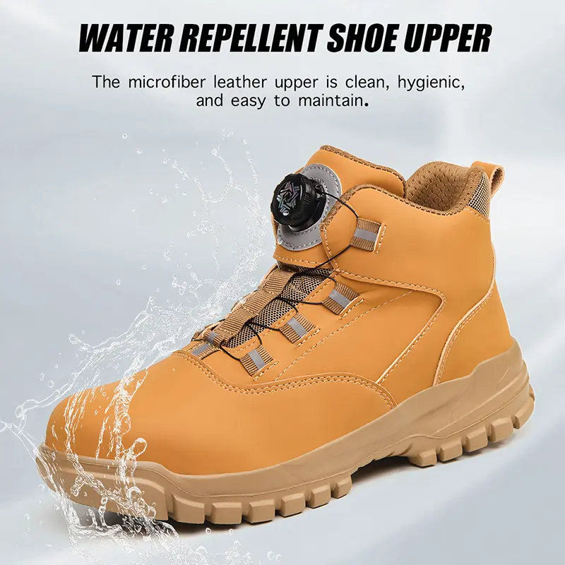 Men’s safety shoes with steel toes, impact-resistant and puncture-proof; non-slip, wear-resistant high-top safety boots; quick lace-up with rotating buttons; waterproof, splash-resistant upper; suitable for construction sites, durable and long-lasting.