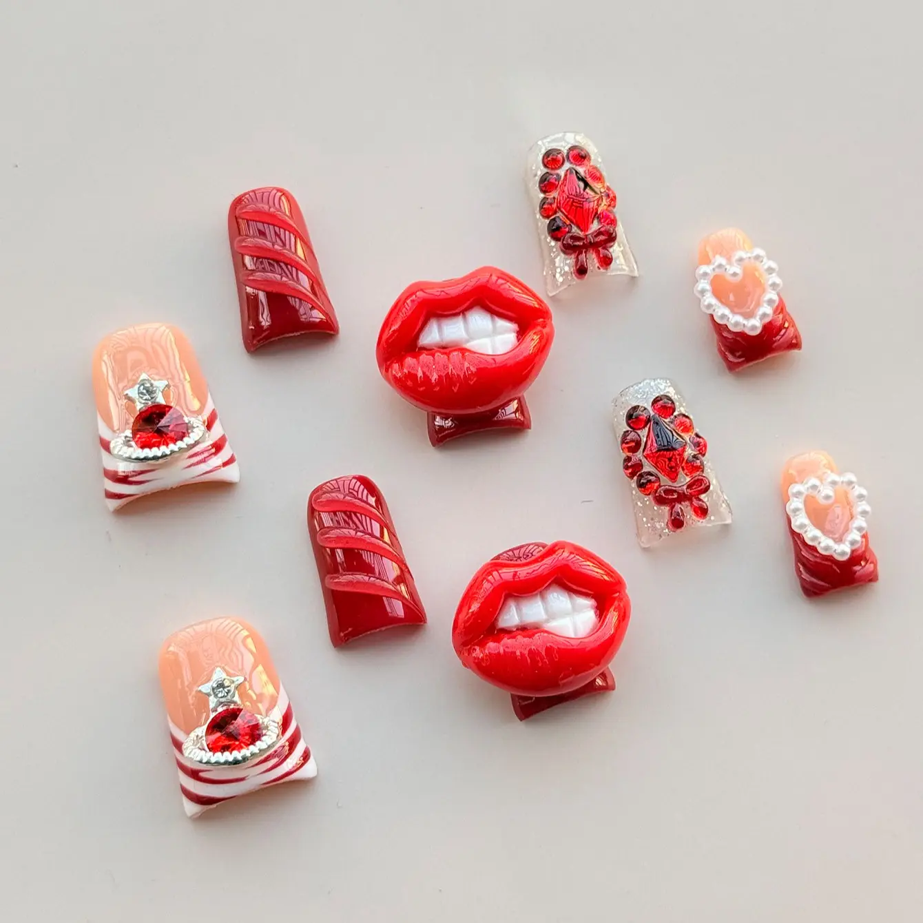 Y2K 10-Piece Handmade Nail Art Set, Hot Lips, Sexy Style, Medium-Length Almond Nails, Planetary Decor, Luxurious Polish, Perfect for Parties