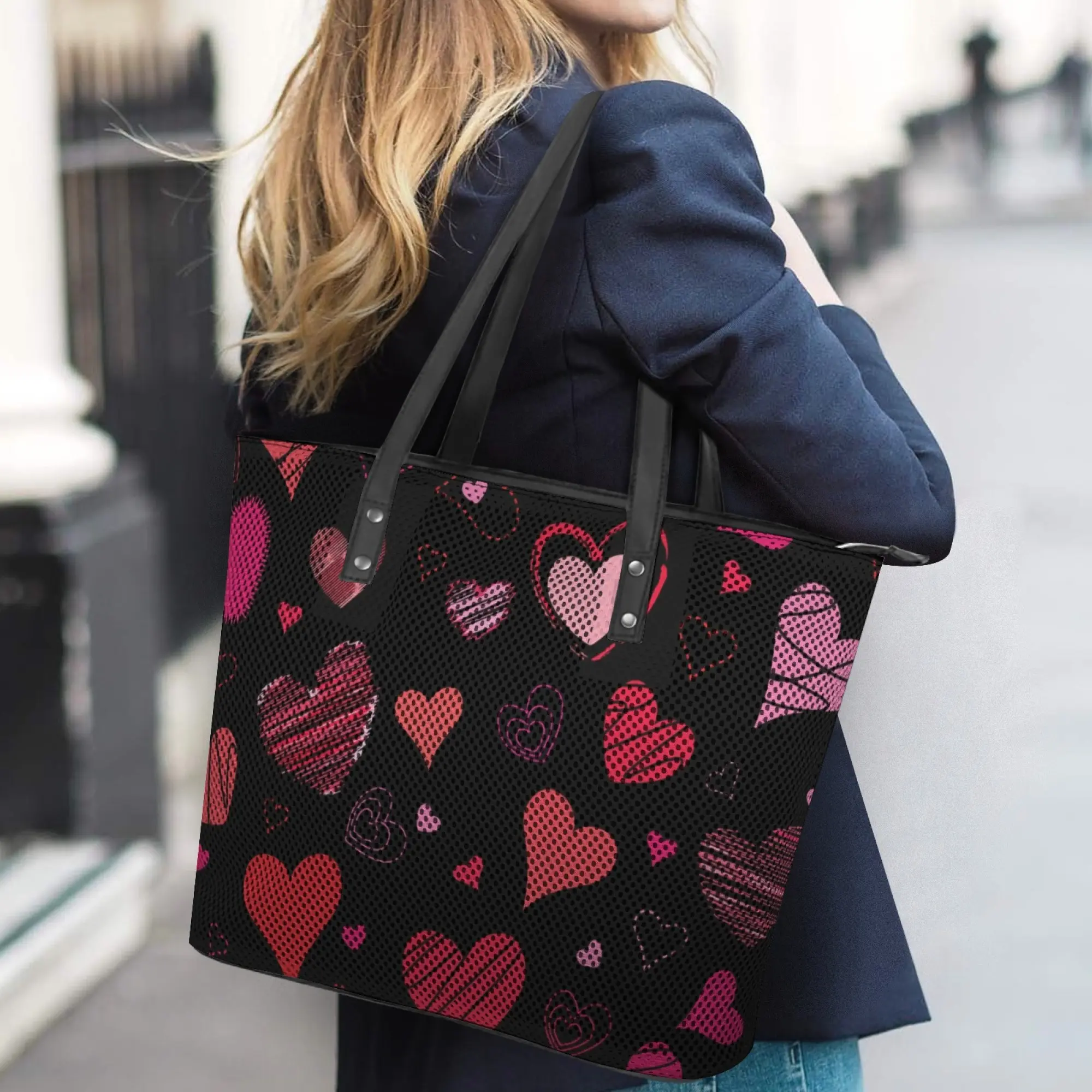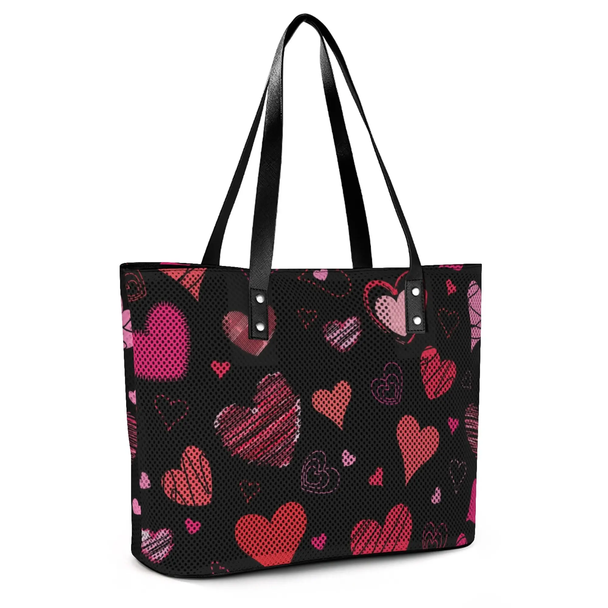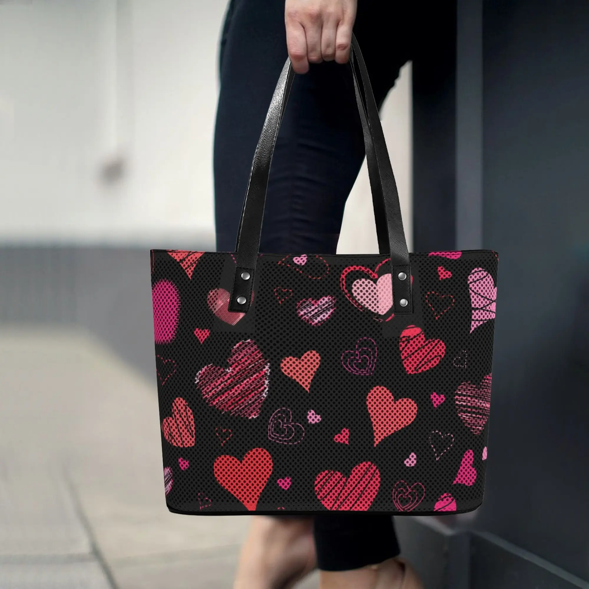 Adorned with a vibrant mix of hand-drawn red and pink hearts on a sleek black dotted background, this tote bag blends playful romance with modern style. The eye-catching, unique print makes it a perfect statement accessory for everyday wear, date nights, or Valentine's Day gifting.