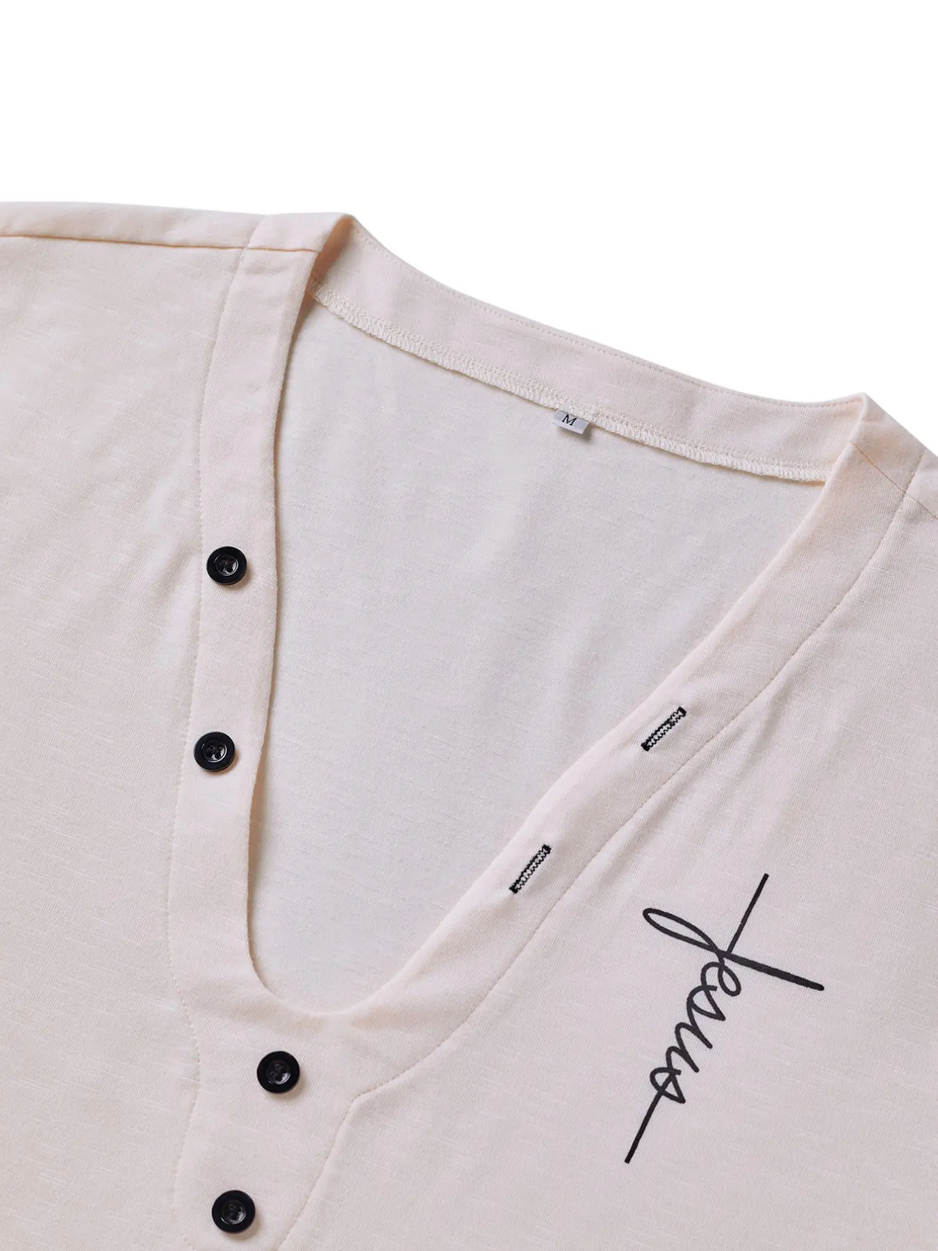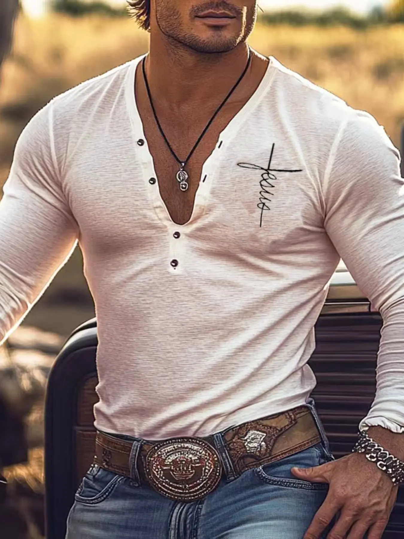 Elegant Men's Henley Shirt, Unique Print, Breathable Polyester Fiber, Button Details, Suitable for All Seasons, Henley Shirt