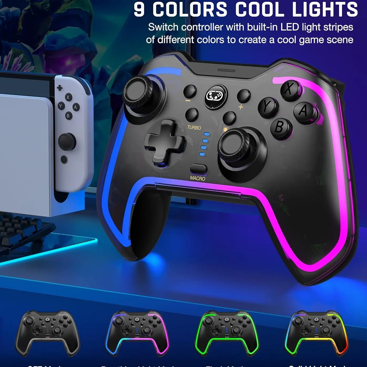 ·【10 COLORS LED LIGHT & 3 MODES】The Switch controllers made of tough PC transparent material, with an embedded LED strip that combines 10 colors to create a captivating gaming lighting atmosphere. It offers 3 different light modes, which can be easily controlled using an additional button. Customize the lighting effects according to different games and immerse yourself deeply in the game world