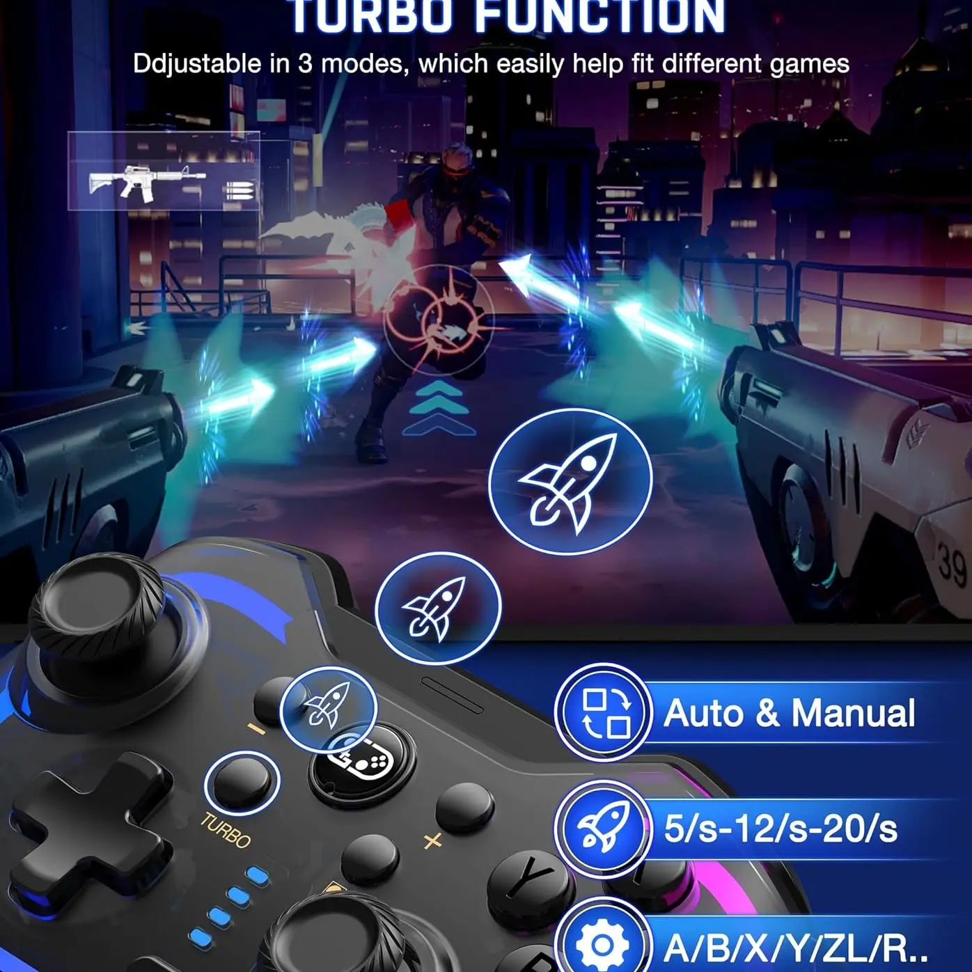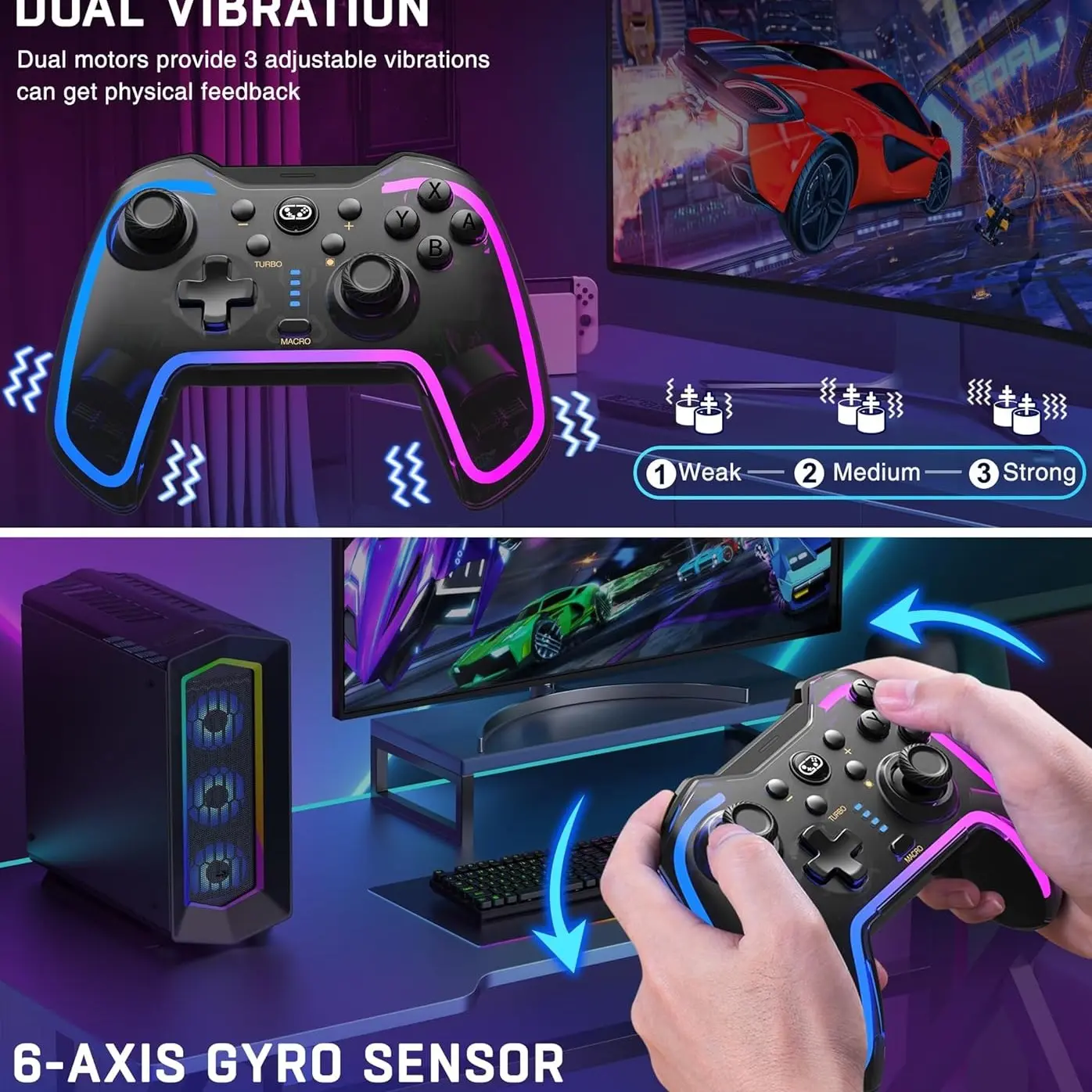 ·【ADJUSTABLE TURBO & VIBRATION FUNCTION】The Wireless Switch Pro Controller can be set to auto TURBO or manual TURBO mode. You can customize the TURBO+A/B/X/Y/L/R/ZL/ZR buttons to fit your fingers. There are 3 adjustable speeds: 5 shots/s, 12 shots/s, or 20 shots/s. What's more, the controller also has dual vibration motors with 4-level precise vibration: None, Weak, Medium, and Strong, providing excellent vibration feedback to enhance game immersion