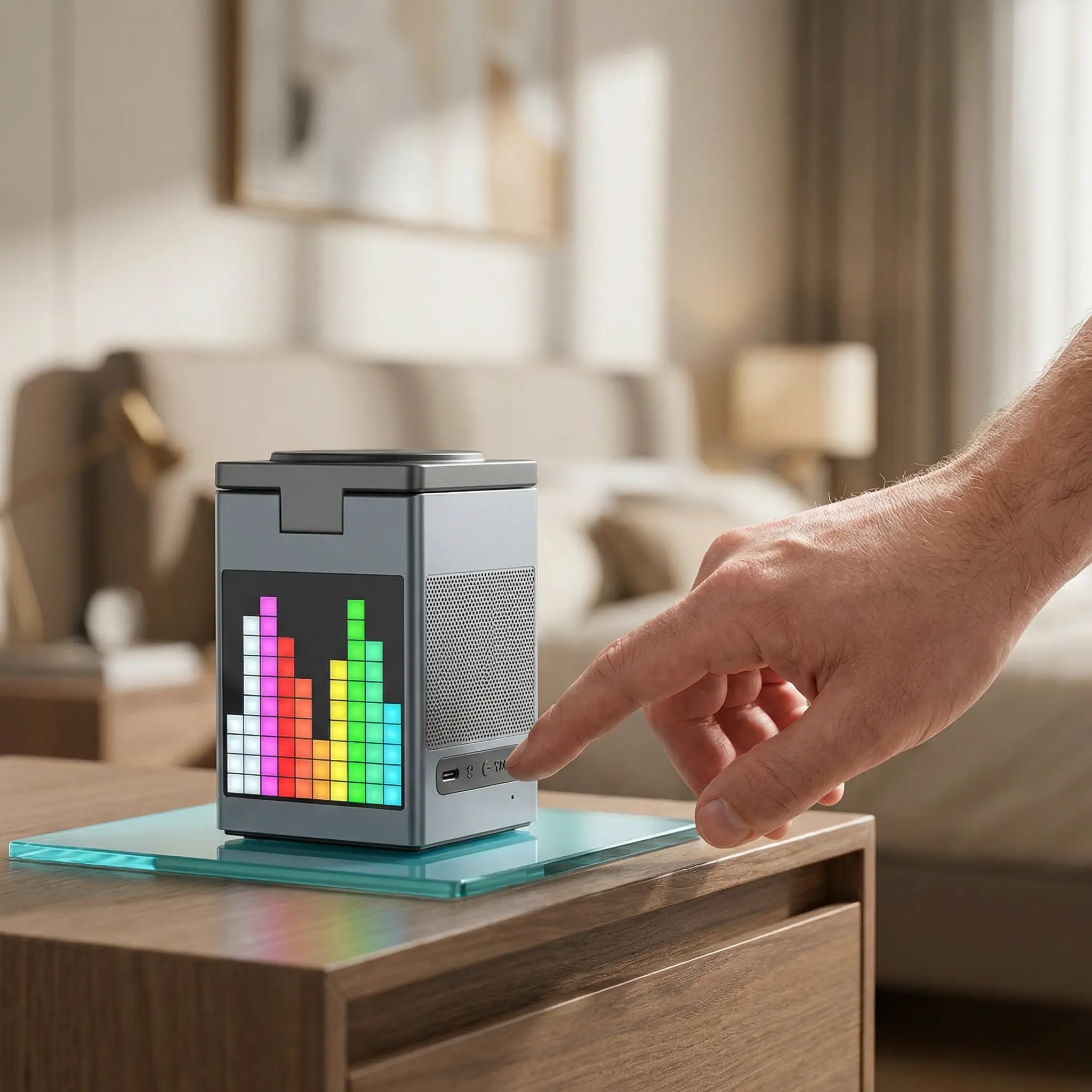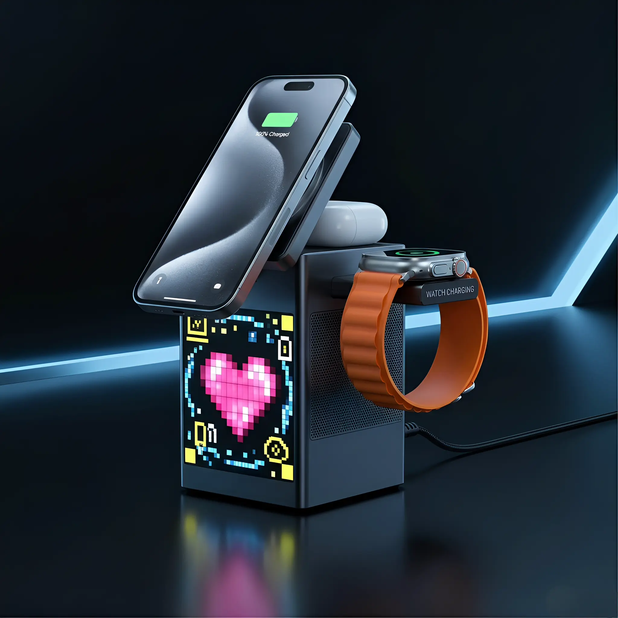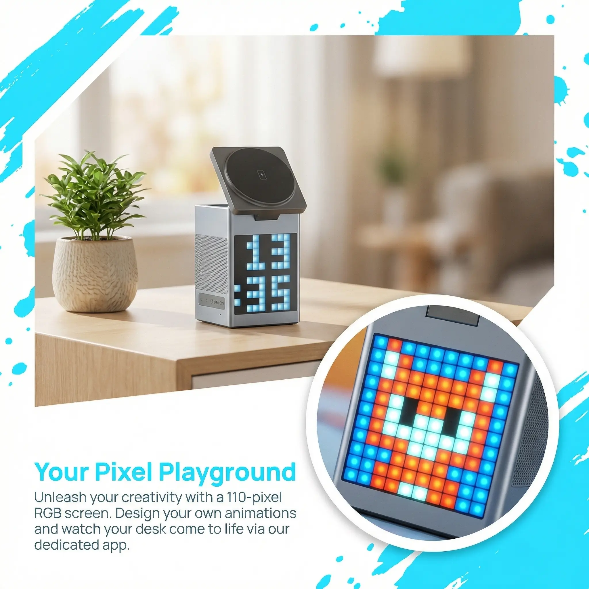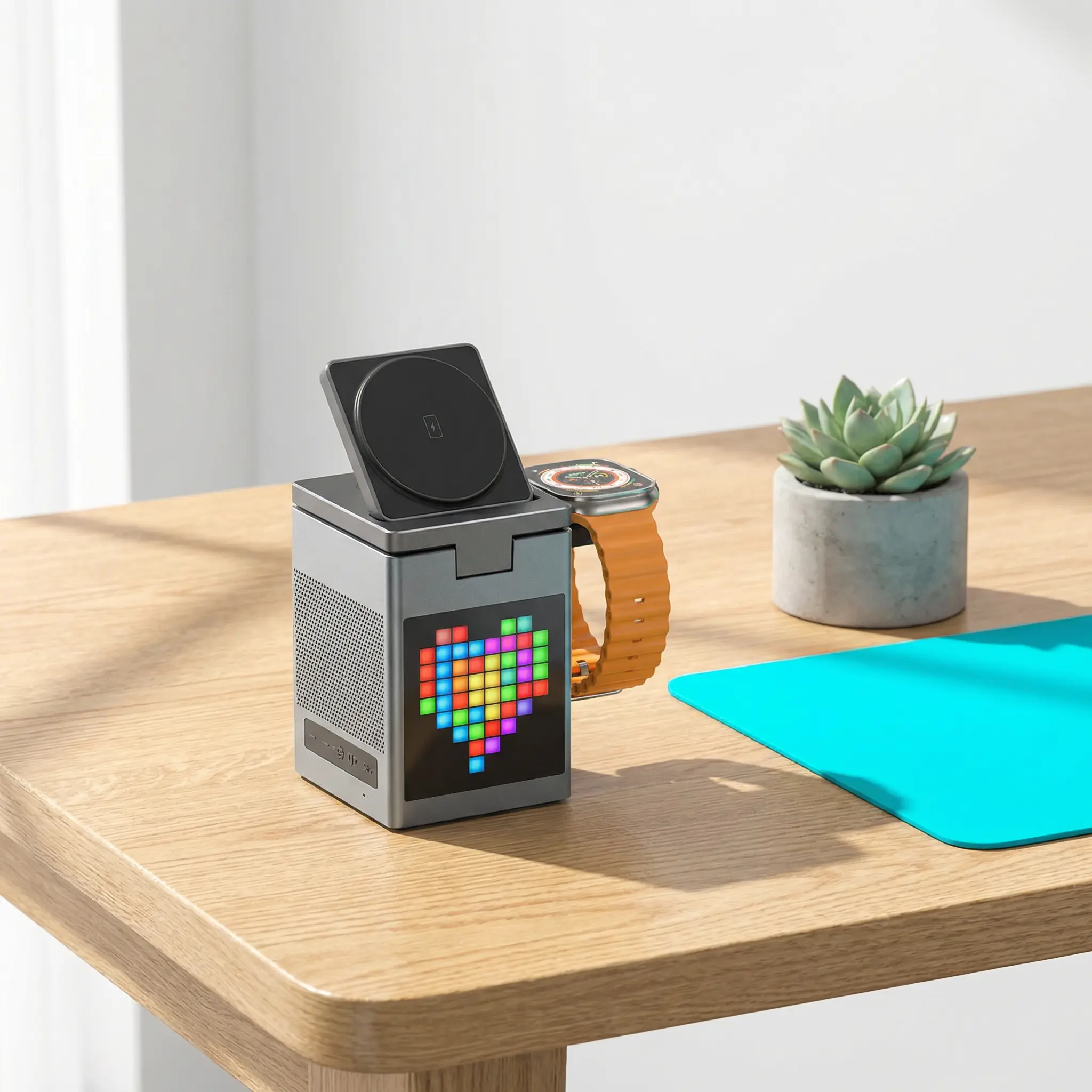 3. 6-in-1 Multi-Function Integration Combines wireless charging, Bluetooth speaker, pixel art screen, and digital clock/alarm. Multi-power output compatible with Apple/Android devices.