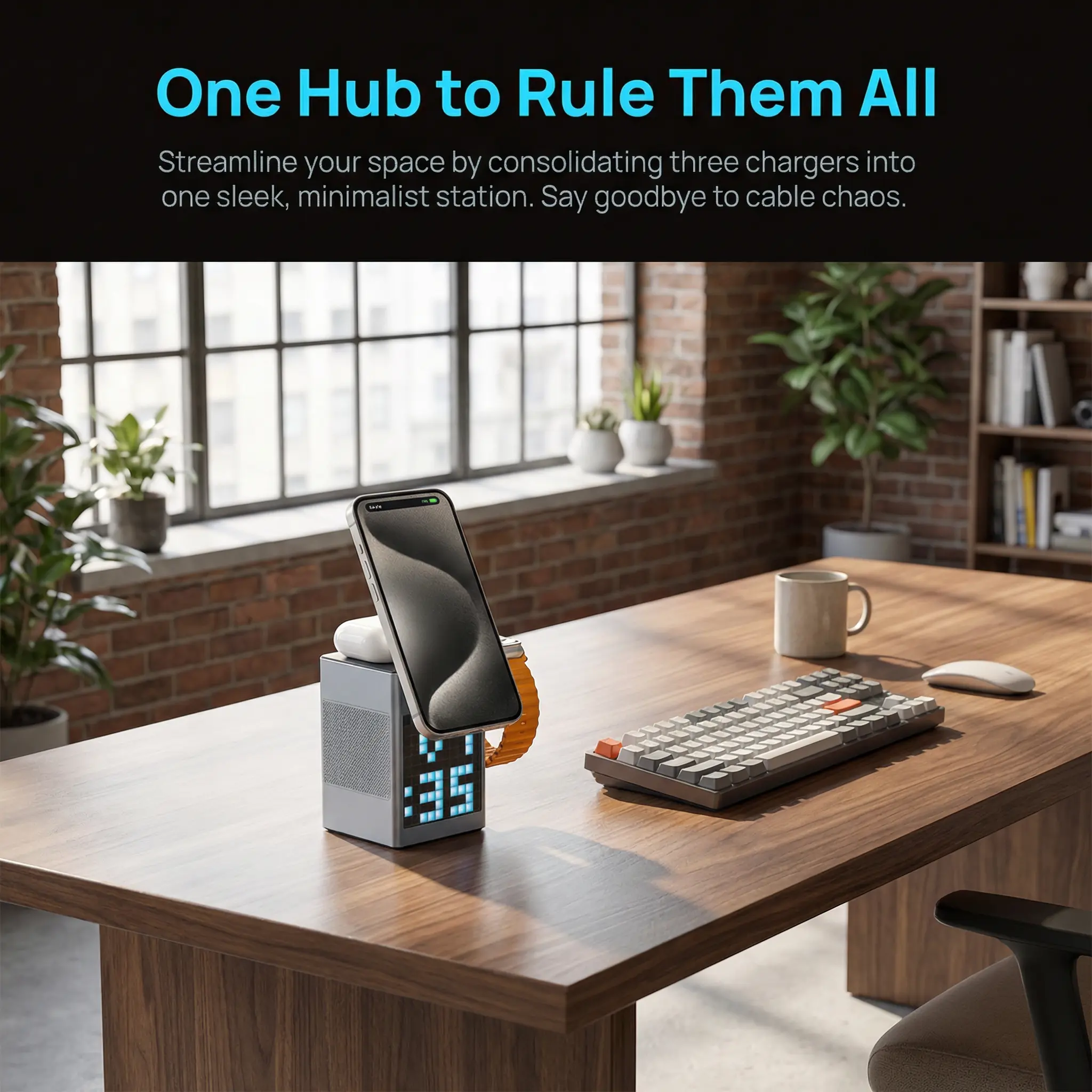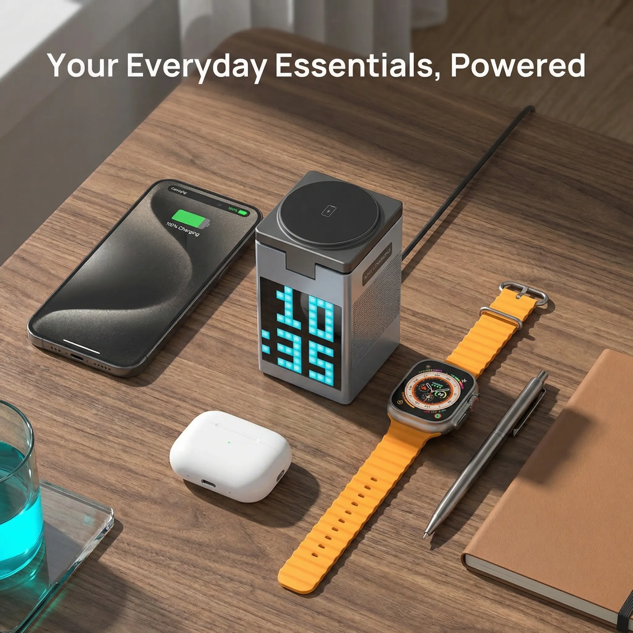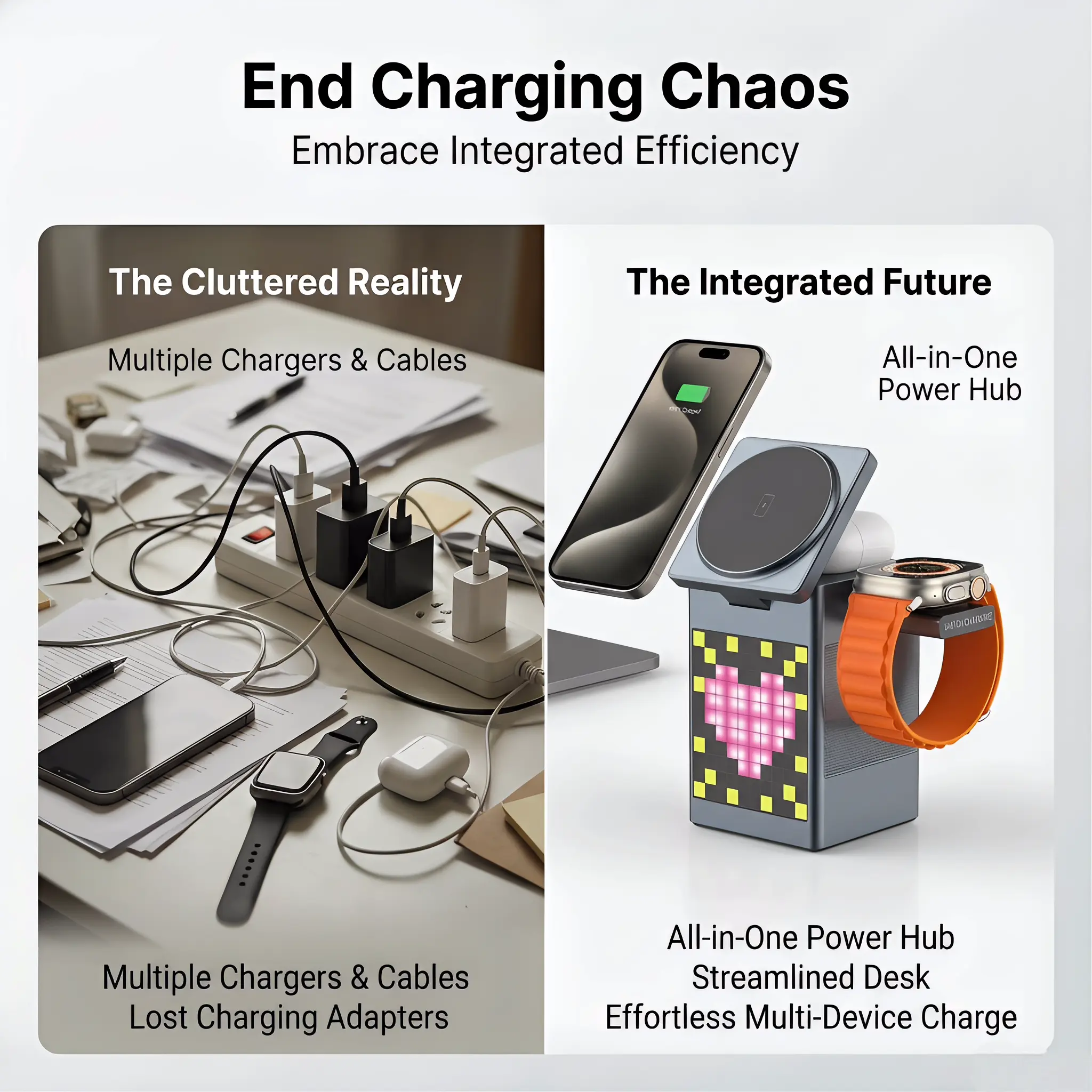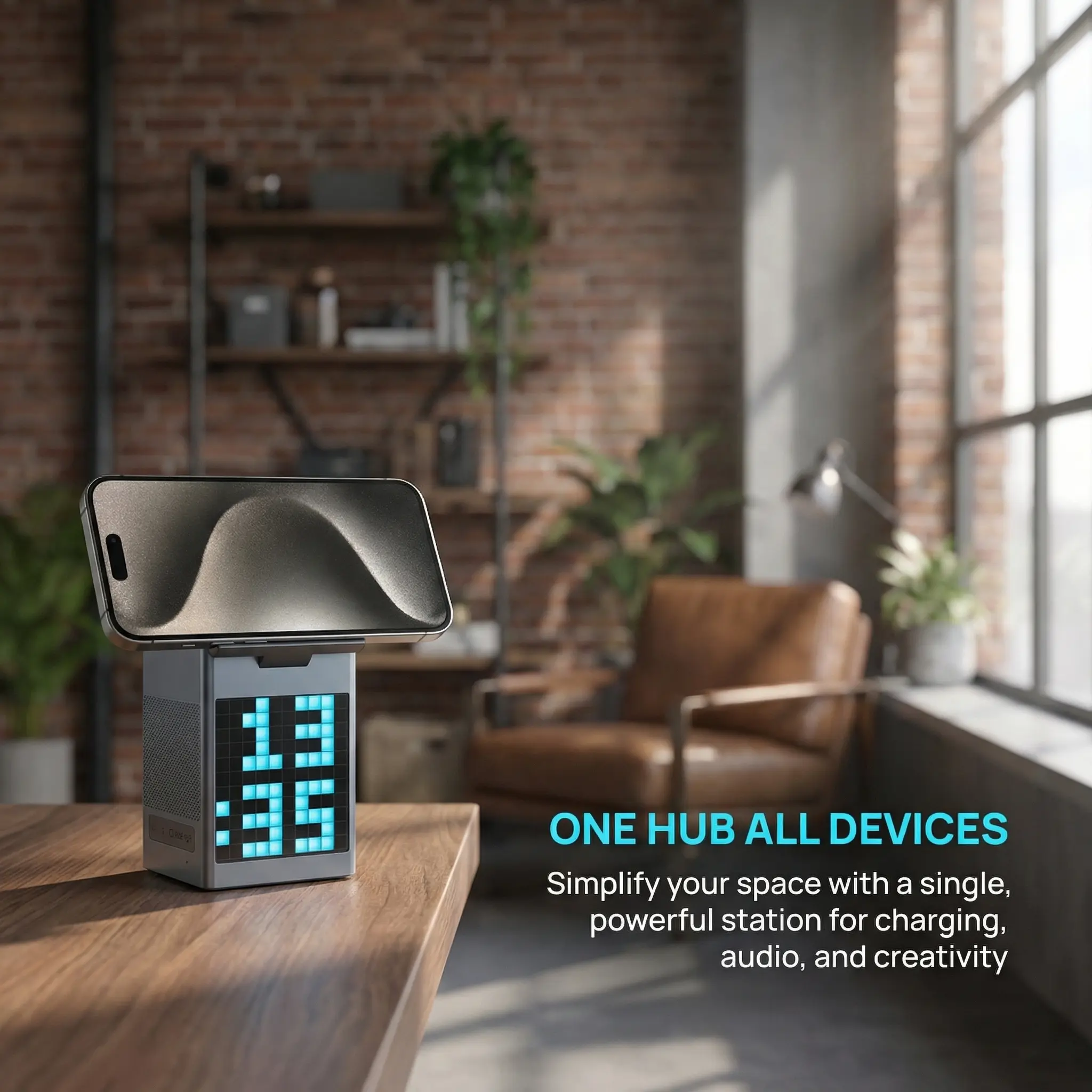 3. 6-in-1 Multi-Function Integration Combines wireless charging, Bluetooth speaker, pixel art screen, and digital clock/alarm. Multi-power output compatible with Apple/Android devices.