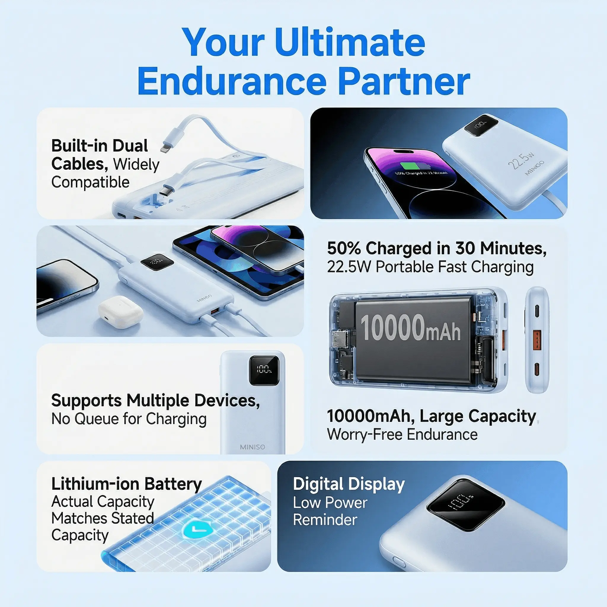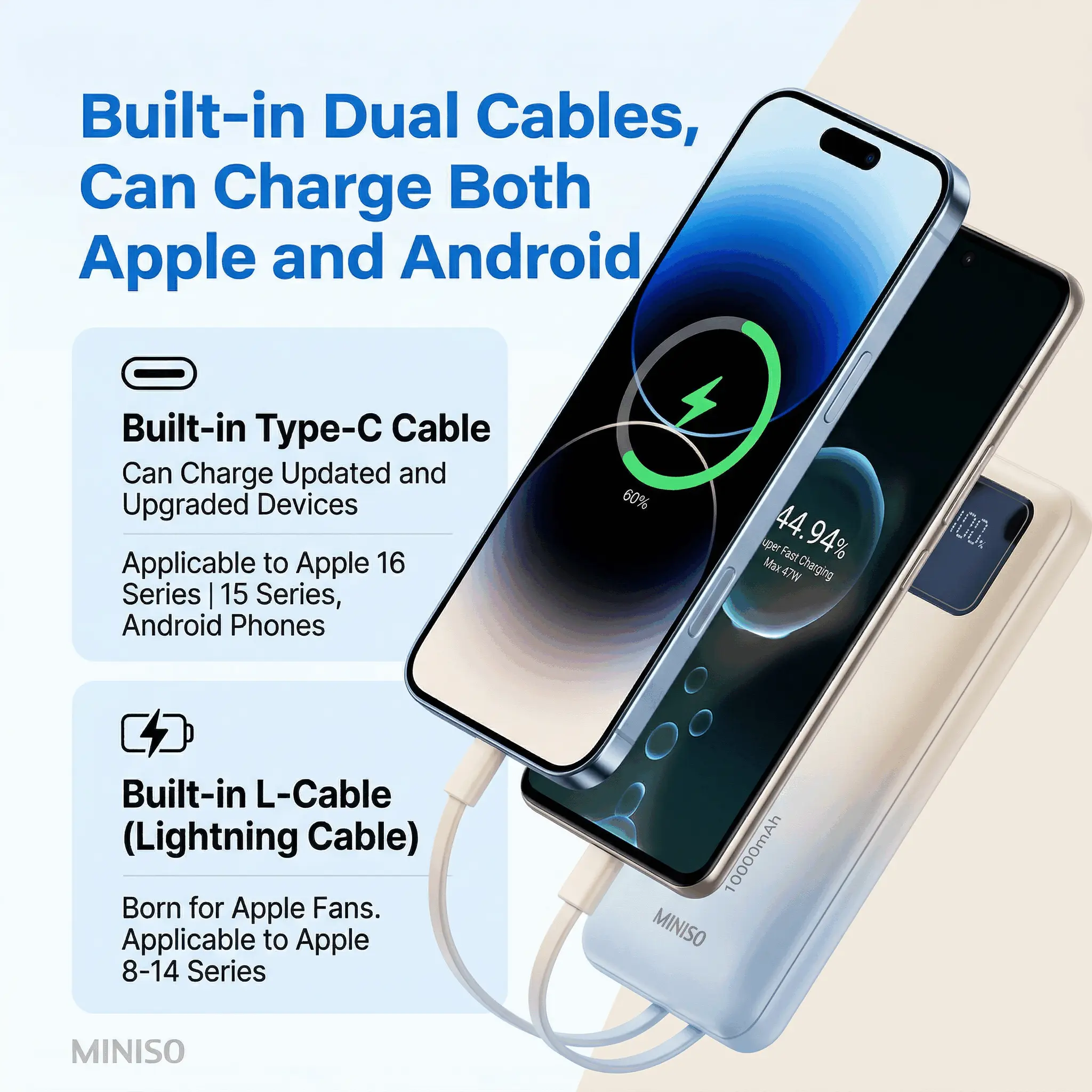Stay powered on the go with the MINISO 2025 Power Bank. This sleek device is 3C certified, ensuring safe and fast charging. Perfect for travelers, it's airline-approved, making it a must-have tech gadget. Its slim design and high capacity make it a travel essential. Charge your devices effortlessly with built-in cables.