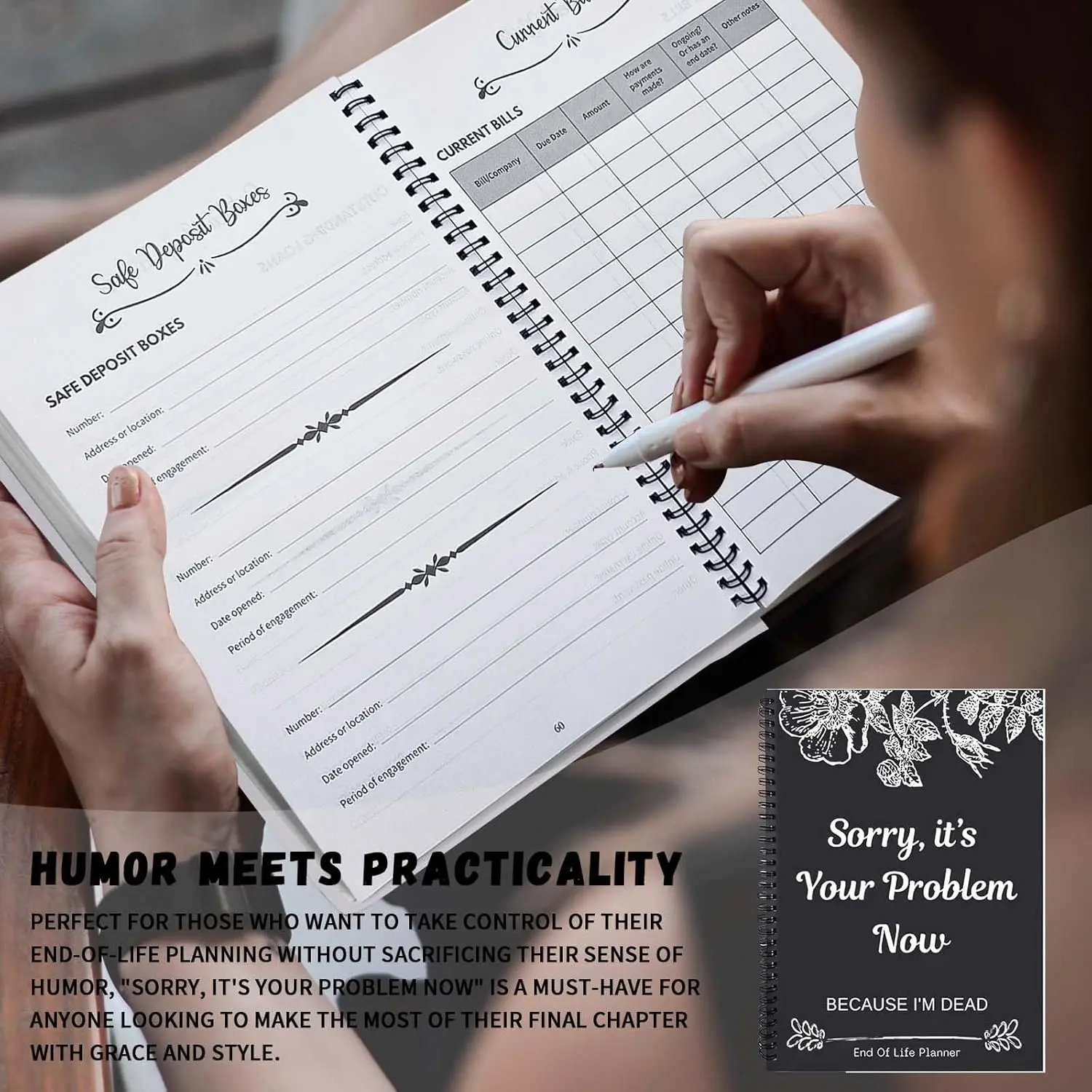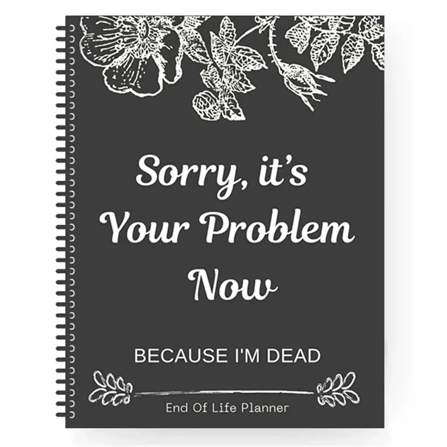 End of Life Plan Organizer Workbook: The End of Life Plan Organizer Workbook is a humorous end of life plan tool titled "Sorry, it's your problem now because I'm dead." This fun version of the End of Life Plan can help you easily organize your final arrangements. Solved a taboo topic with humor and elegance