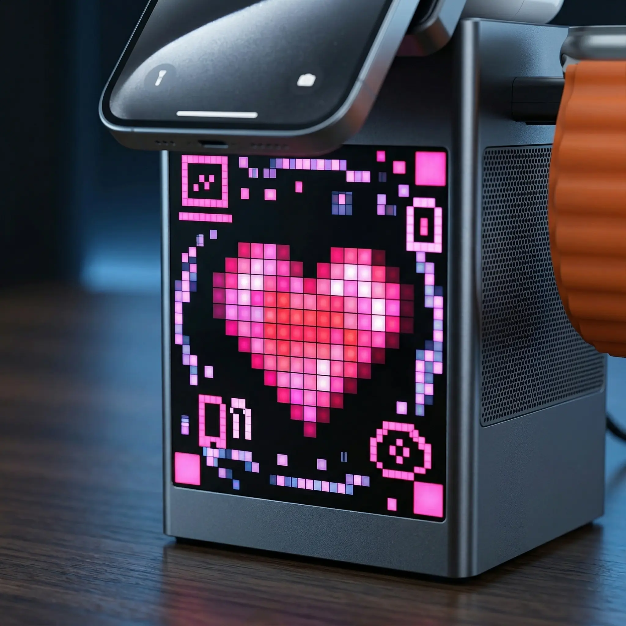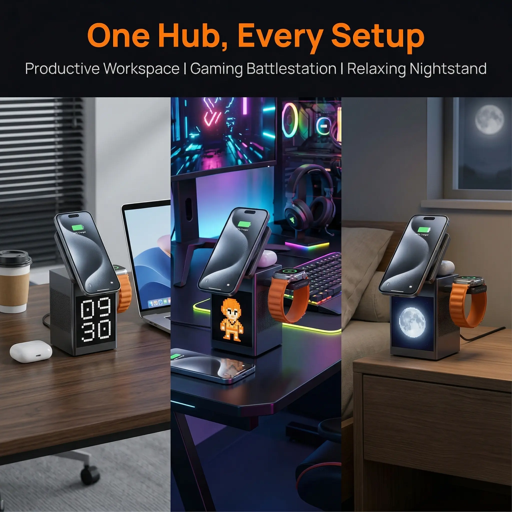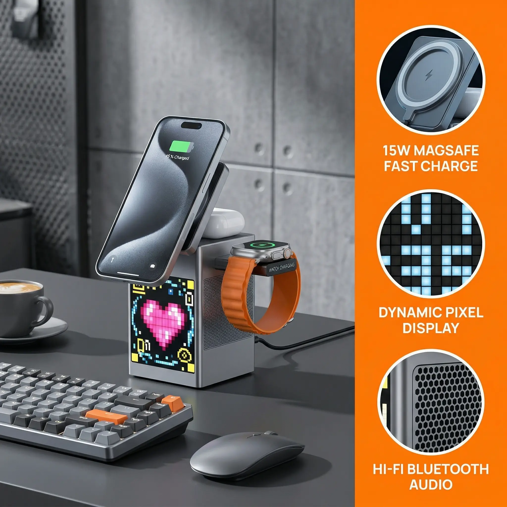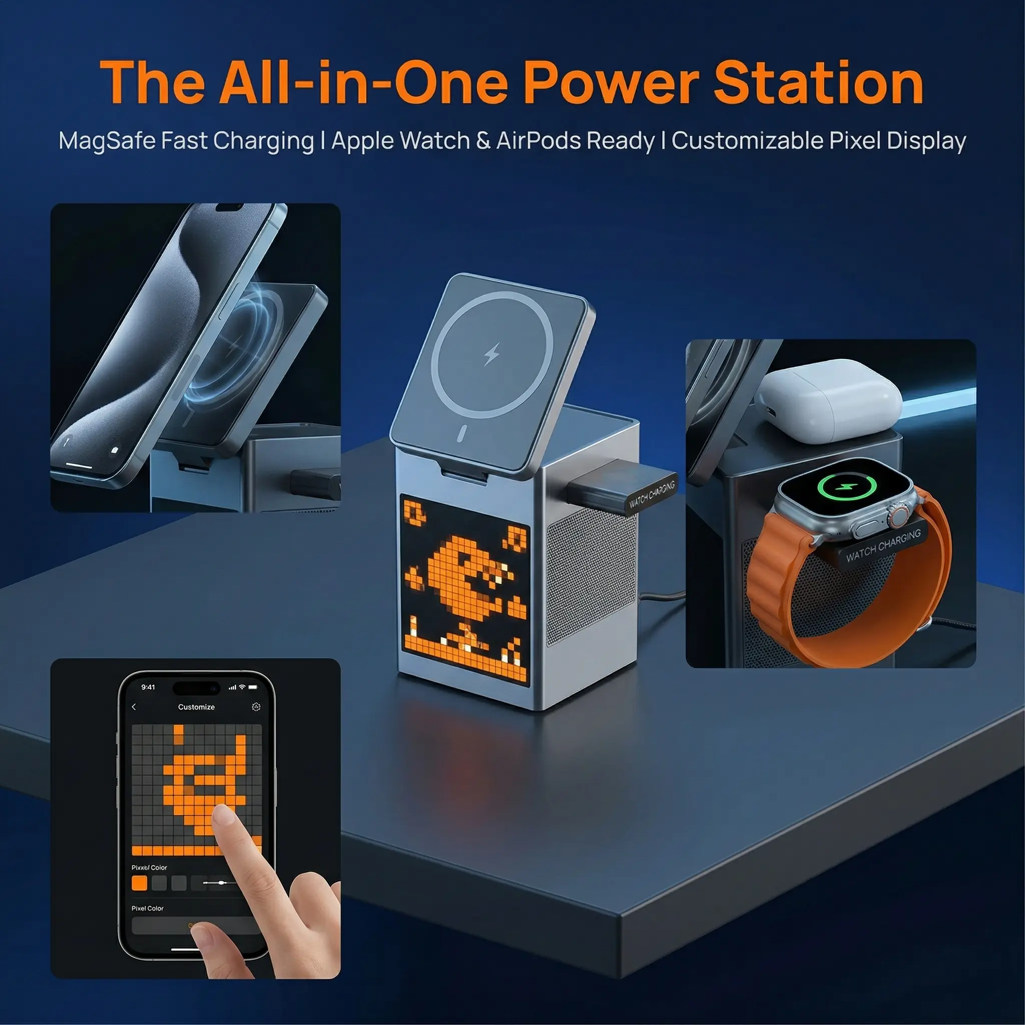 6-in-1 MagSafe-Compatible Magnetic Charger | with Clock & Pixel Display | Multi-Device Desktop Charging Station | Smart Travel Companion for March Madness, Spring Break, World Cup & Easter