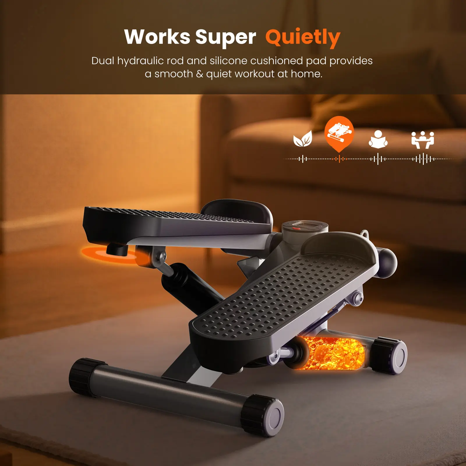Ultra-Quiet Dual Hydraulic System Powered by dual hydraulic rods paired with a silicone cushioned pad, this stepper operates with minimal noise, making it ideal for home use — whether you're exercising in the kitchen, at your desk, or while watching TV — without disturbing others around you.