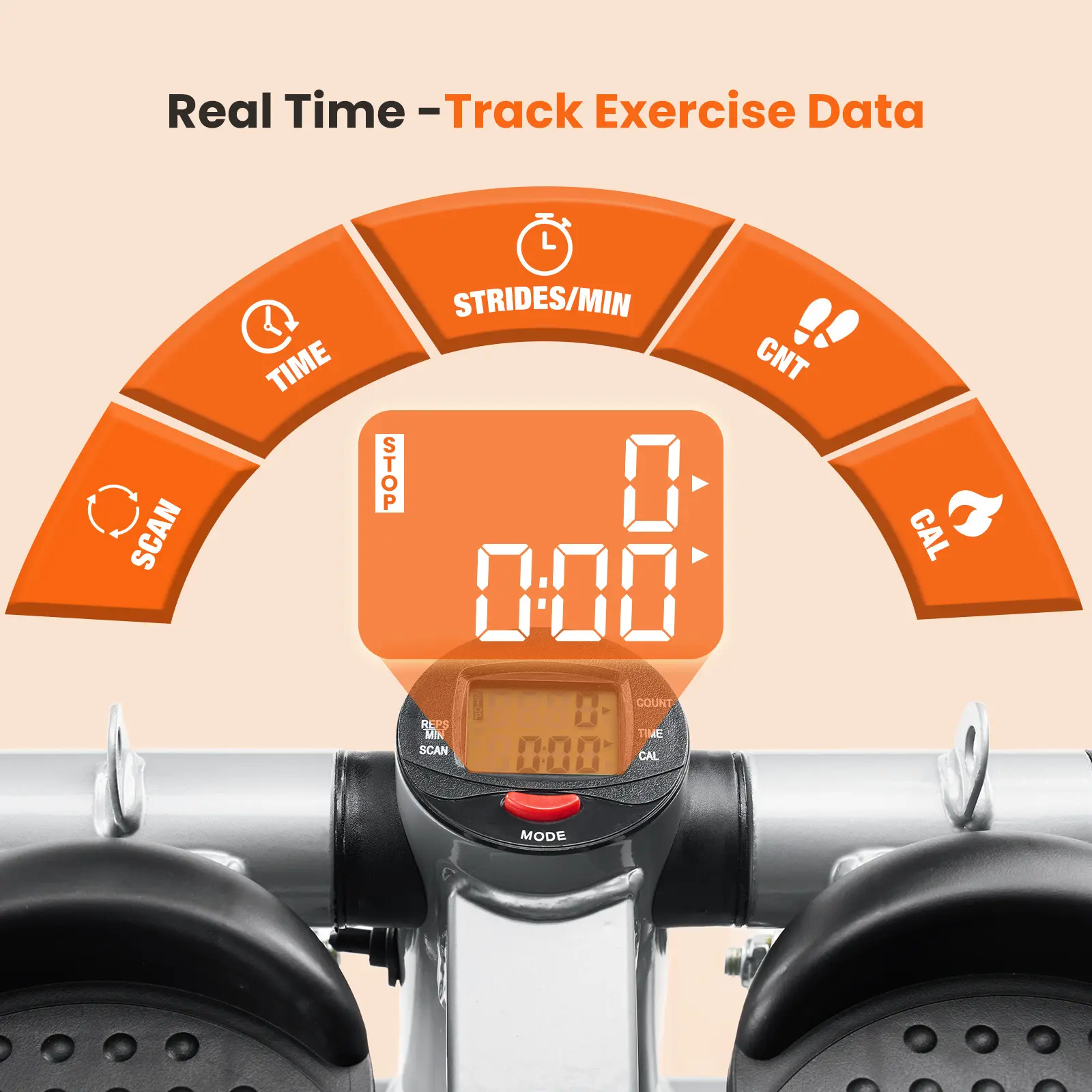 Built-in LCD Monitor for Real-Time Tracking The integrated digital display tracks five key workout metrics — time, strides per minute, step count, calories burned, and scan mode — so you can monitor your progress and stay motivated throughout every session. Compact dimensions (12.8"L × 11.8"W × 3.35"–11"H) make it easy to use and store anywhere.