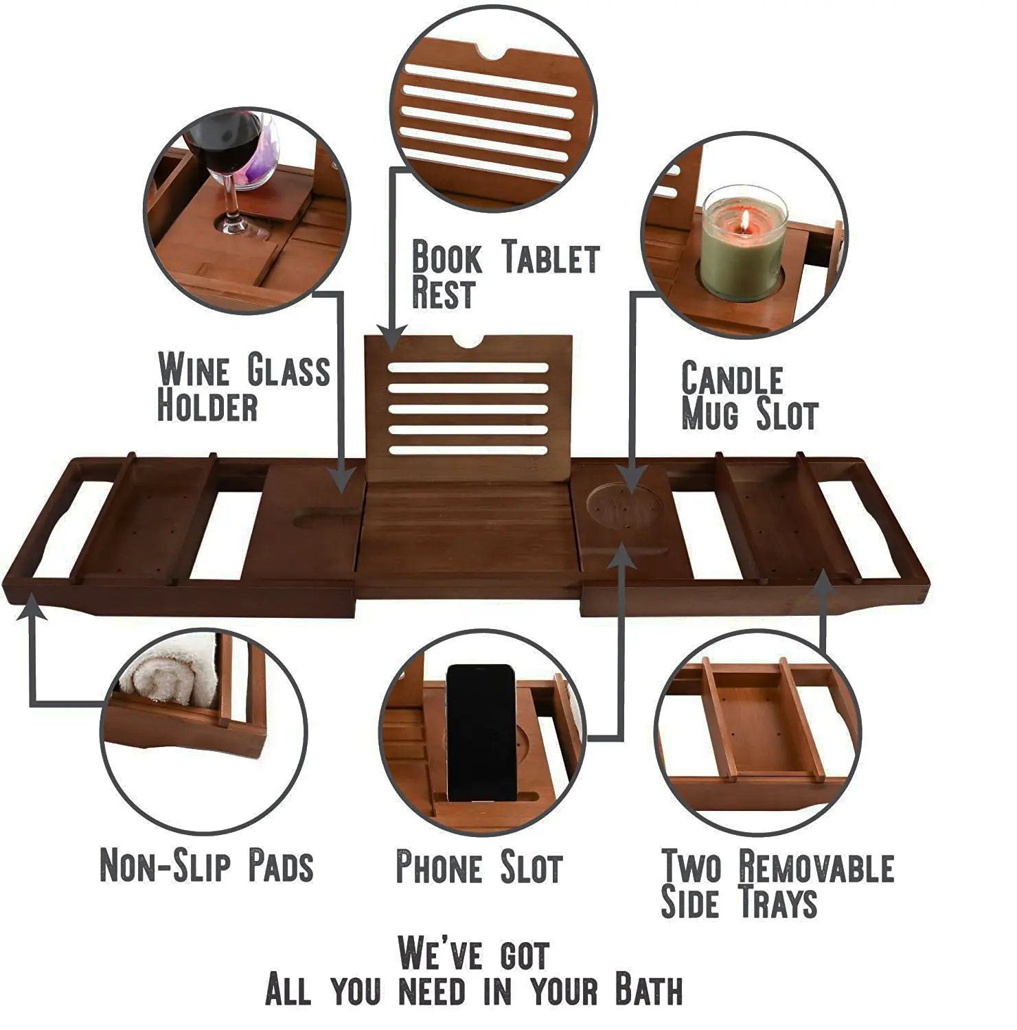 Bamboo Bathtub Caddy Tray - Expandable for Luxury Bath, Bath Accessories & Table with Wine Glass Holder, Book Stand - Bathroom Organizer with Extending Sides, Brown