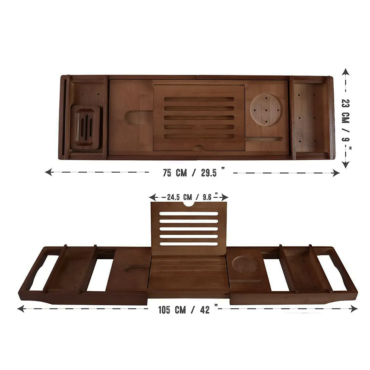 Humanized design- this bathtub caddy tray was specially designed to fit most bathtubs available on the market. It has the biggest extendable sides up to 43 inches. A convenient built-in bathtub wine glass holder, two side trays, extendable handles, and soap holder make it perfect for two bathers.