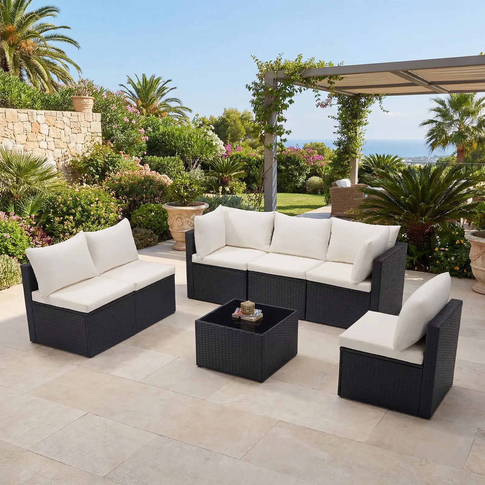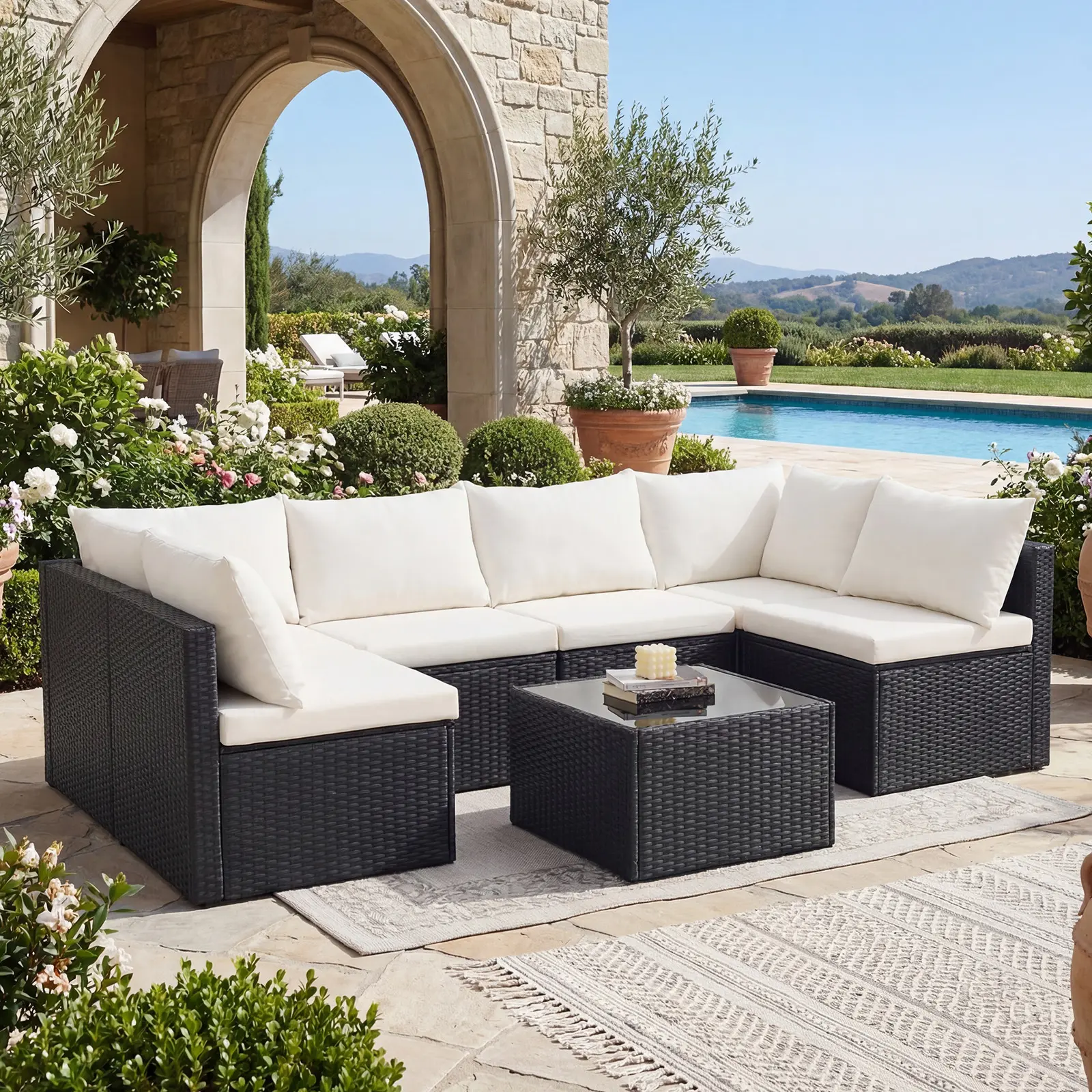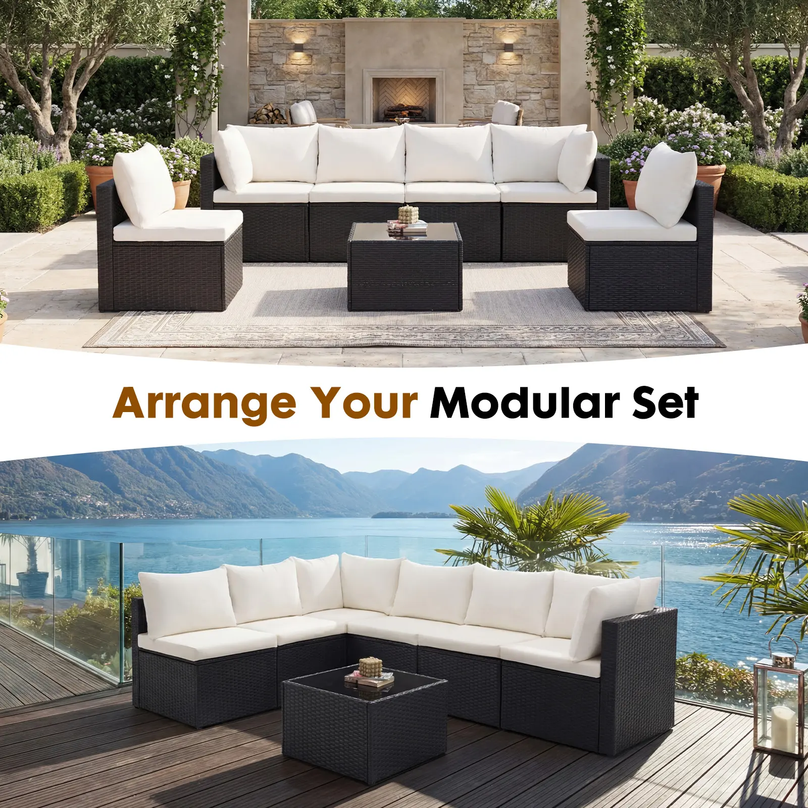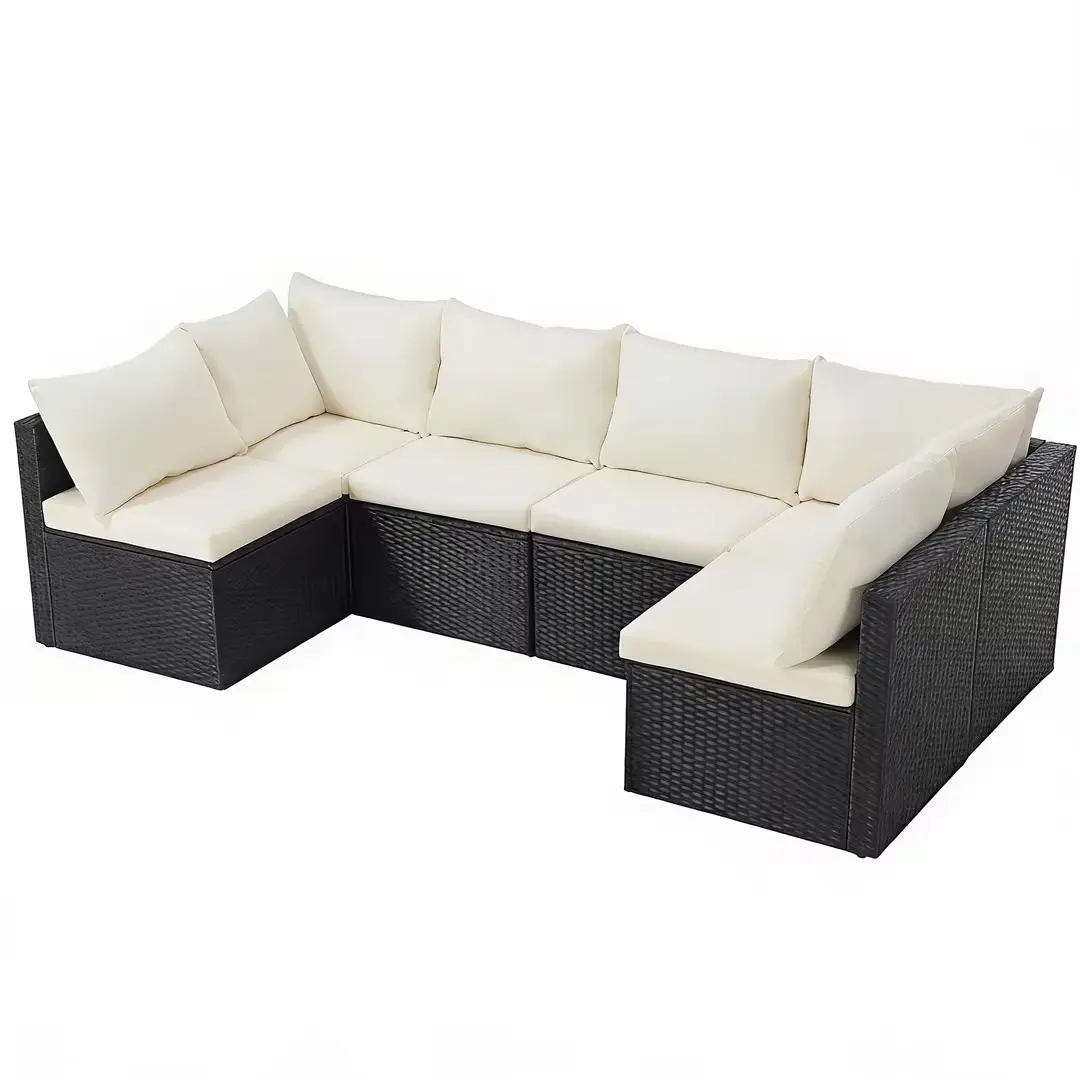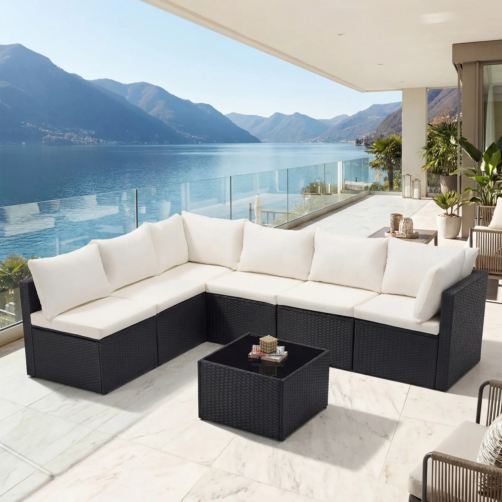 Create lasting memories with this 7-piece patio furniture set. It includes 4 armless chairs, 2 corner chairs, and 1 glass table. The modular design adapts effortlessly to family gatherings or quiet relaxation in any outdoor space. Perfect for backyards, decks, gardens, and poolside areas.