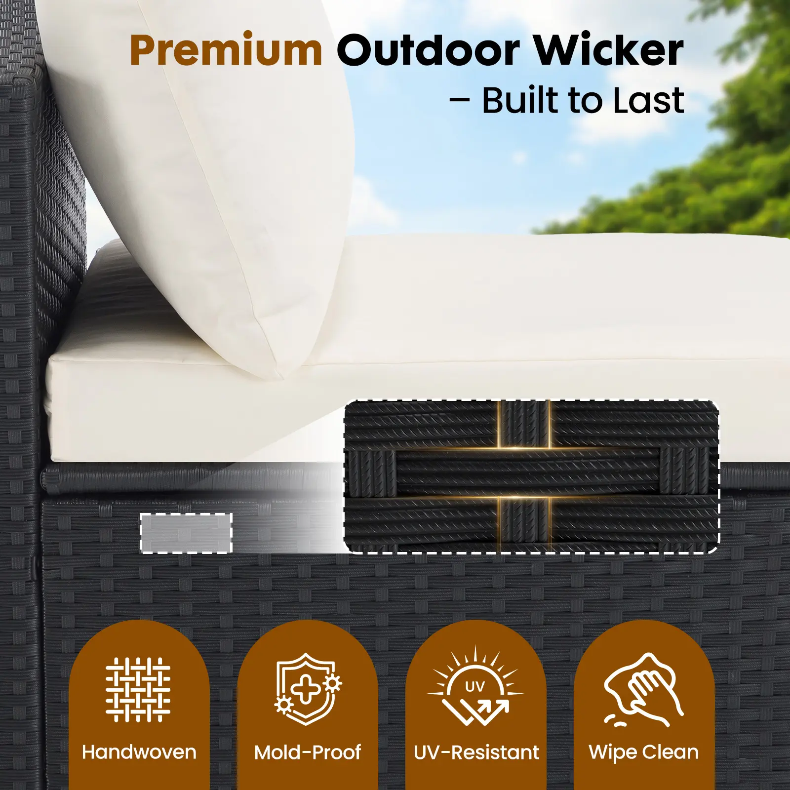This wicker patio furniture set comes with adjustable feet for stability on uneven surfaces. The removable, machine-washable, water-resistant cushion covers make cleaning a breeze. Relax and enjoy your outdoor space without the hassle.
