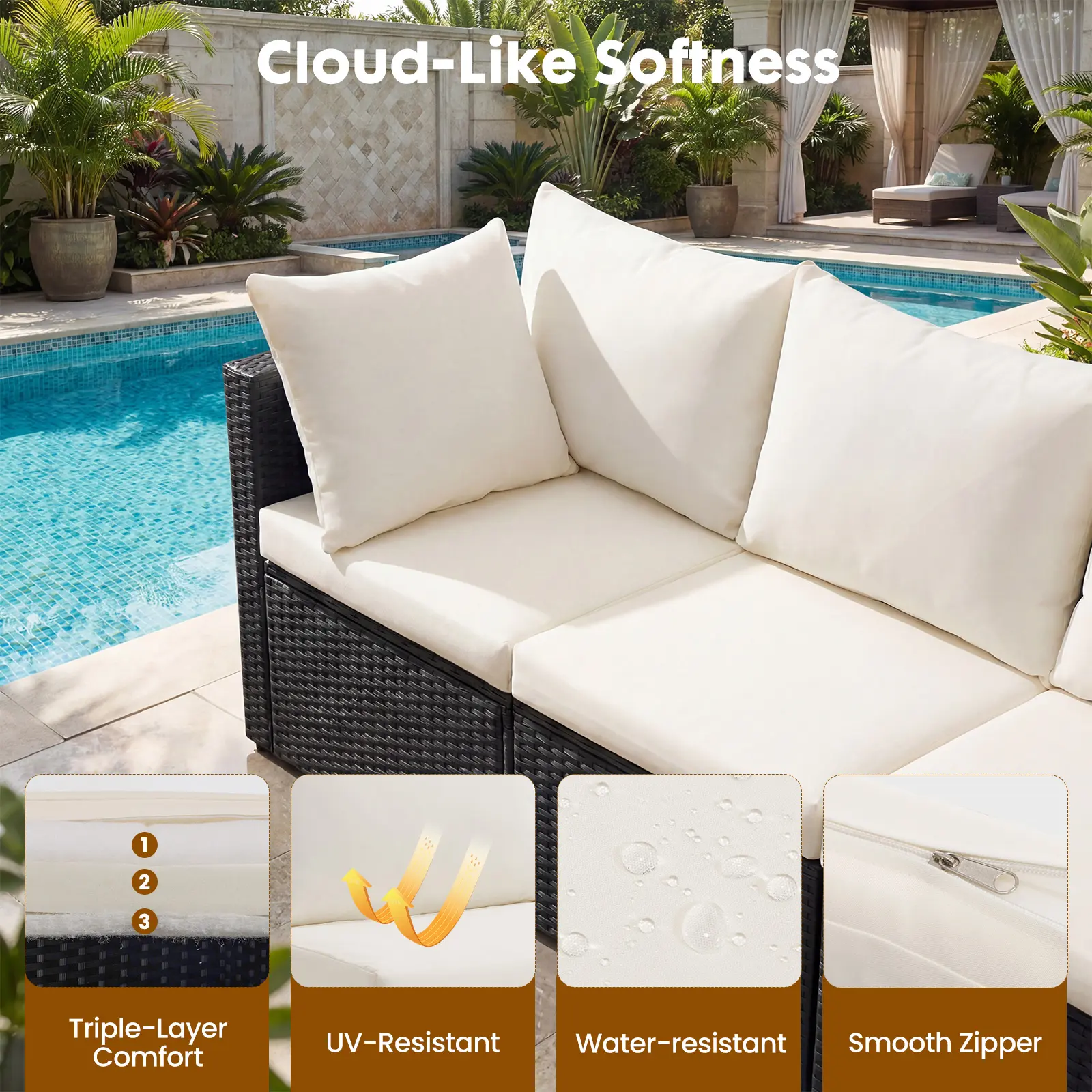 Enjoy exceptional comfort with thick padded cushions. The cushions feature a high-density foam core layered between soft fiber fill. This design offers an ideal balance of softness and support for years of relaxed backyard lounging. Experience ultimate comfort in your outdoor space.