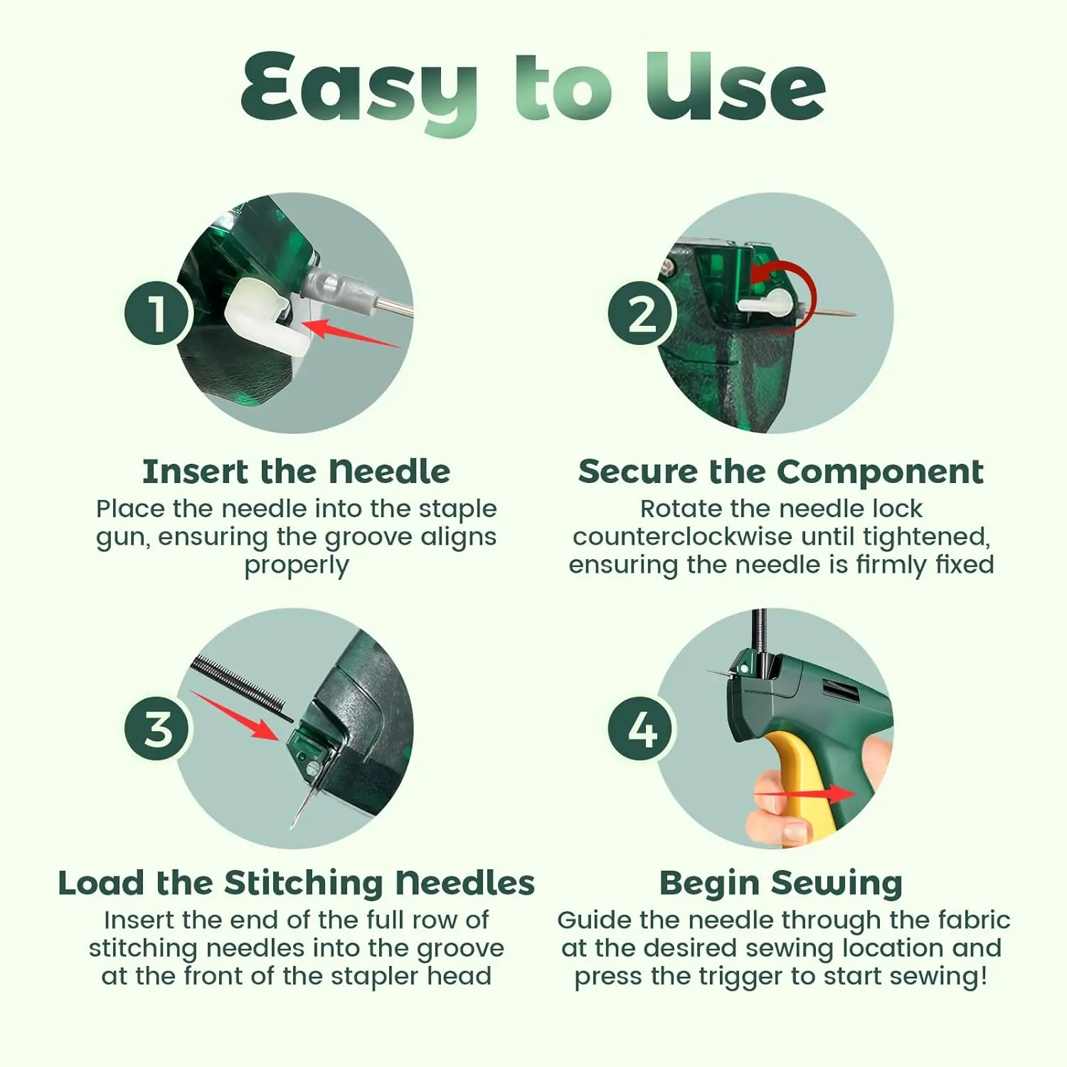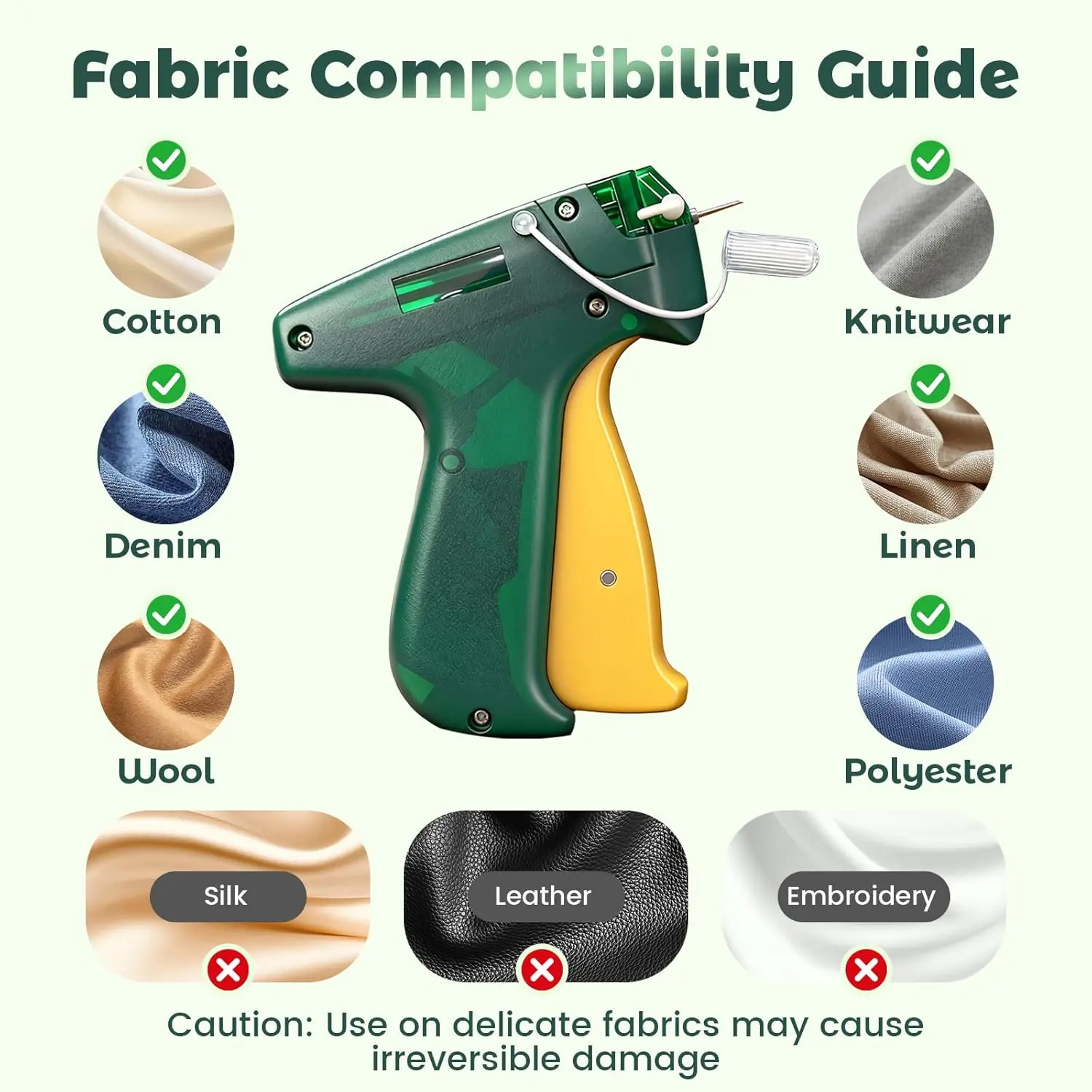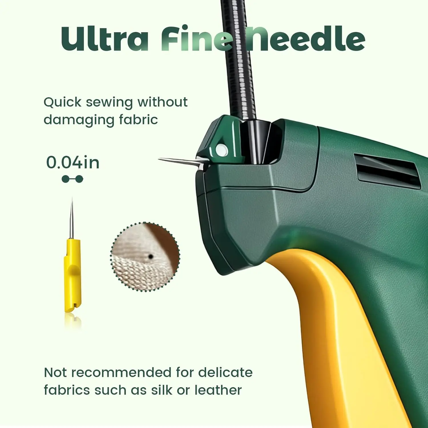 [Quick Fabric Fixes]Instantly repair tears, close seams, fix loose hems, secure buttons, and adjust necklines or waistbands.This stitch gun for clothes is faster than using safety pins and handles a variety of tasks on clothes, curtains, quilts, and upholstery, making it ideal for quick adjustments and temporary basting without a sewing machine[Ultra-Fine Needles]Designed to be soft on fabric, our mini stitch gun for clothes features the smallest needle design.The extra-fine, smooth stainless steel needle passes quickly through the fabric, minimizing damage and leaving nearly invisible, discreet fixes that are perfect for delicate garments and everyday clothing emergencies[Effortless Operation]Achieve seamless stitching in seconds without any sewing skills.Simply load a fastener, press the lightweight handle, and you're done.The ergonomic, handheld design is comfortable to use and requires no batteries or electricity, making the stitch tag gun greater for home use or on-the-go repairs[Durable Construction]The tagging gun for clothing is built with sturdy, hard ABS plastic and a highly resilient spring for reliable performance.This value pack comes fully assembled with everything you need to start, including quality stainless steel needles and thousands of mini fasteners, ensuring you have sufficient quantity for your daily mending needs[Broad Compatibility]This micro tagging gun is suitable for a wide range of common soft fabrics including wool, linen, cotton, denim, polyester, synthetic fibers, and quilts. Please note: it is not recommended for delicate fabrics, silk, leather, lace, or very fine materials to avoid potential damage