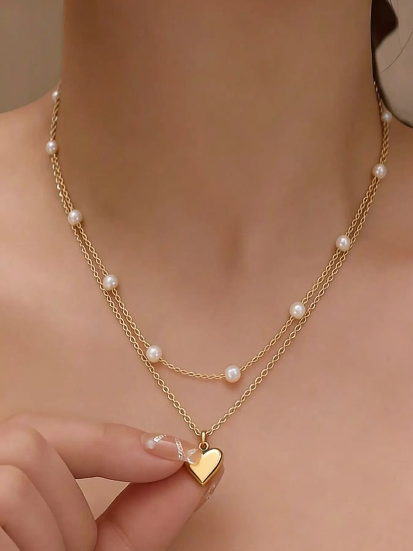 5. Women's Heart Pendant Necklace & Bracelet Set, Dainty Layered Chain with Pearl Beads, Elegant Romantic Jewelry Gift