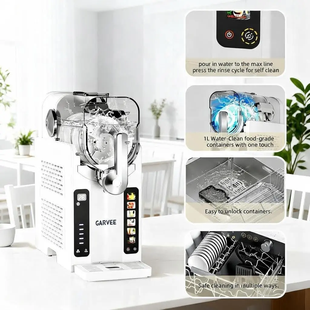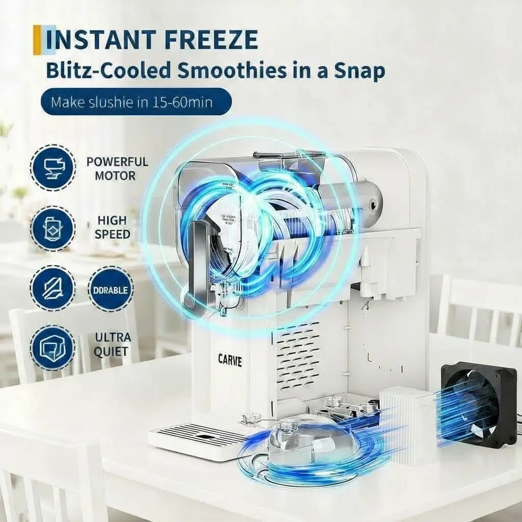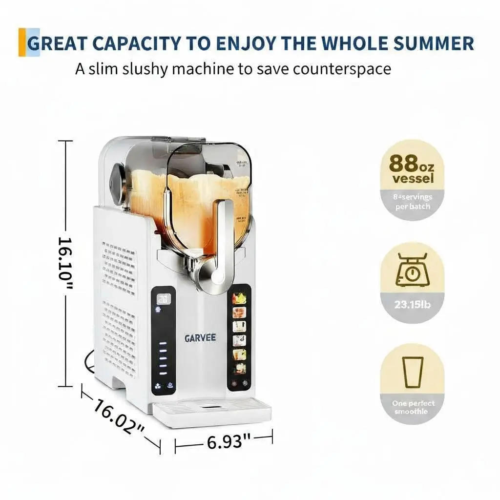 【No Ice Needed, Instant Slush】Garvee home Slushie Machine skips ice prep and pre-chilling—thanks to a quiet high-performance compressor and flash-freezing tech, it turns juices, coffee, or wine into smooth slush in minutes. Usage Note: Mixture needs ≥4% sugar; alcoholic drinks require 2.8%-16% alcohol. Stir well before pouring—do not add ice, solids, or hot liquids. Perfect for quick treats or parties, it delivers restaurant-quality drinks at home.