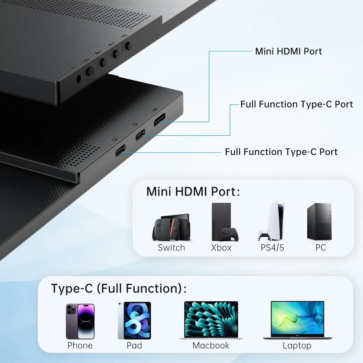 ·Accessory: Type-c*1, HDMI to Mini HDMI Adapter ×1, Power Cord(Use Type-c*1)