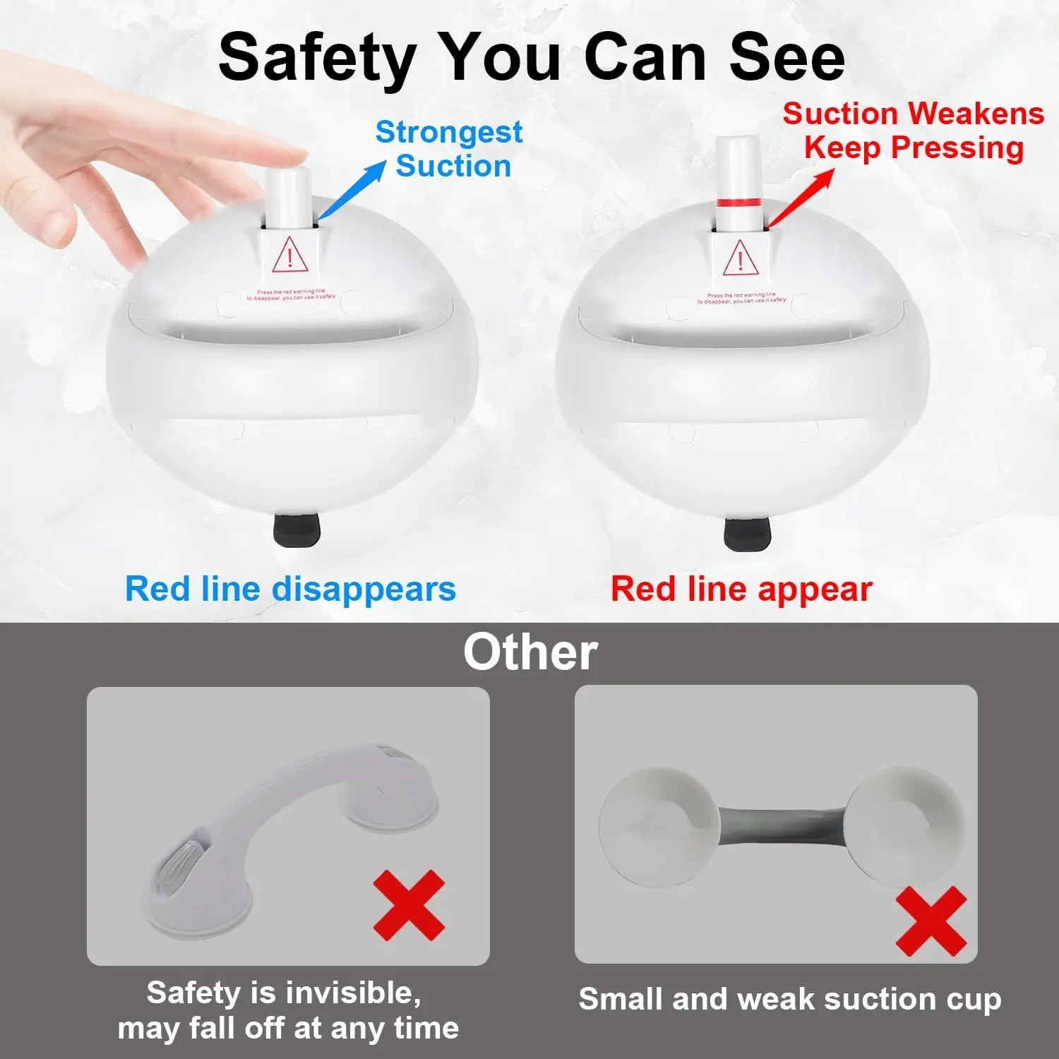 ·【 2024 Upgraded Safety & Anti-slip Design 】 The shower grab bars for seniors has a unique red safety line design. Once the red safety line is exposed, you can press the air pump few times until the red line is invisible, it will be in best working condition, no need worrying it fall off. The unique design has a higher safety factor, ensuring your safety during use shower handle.