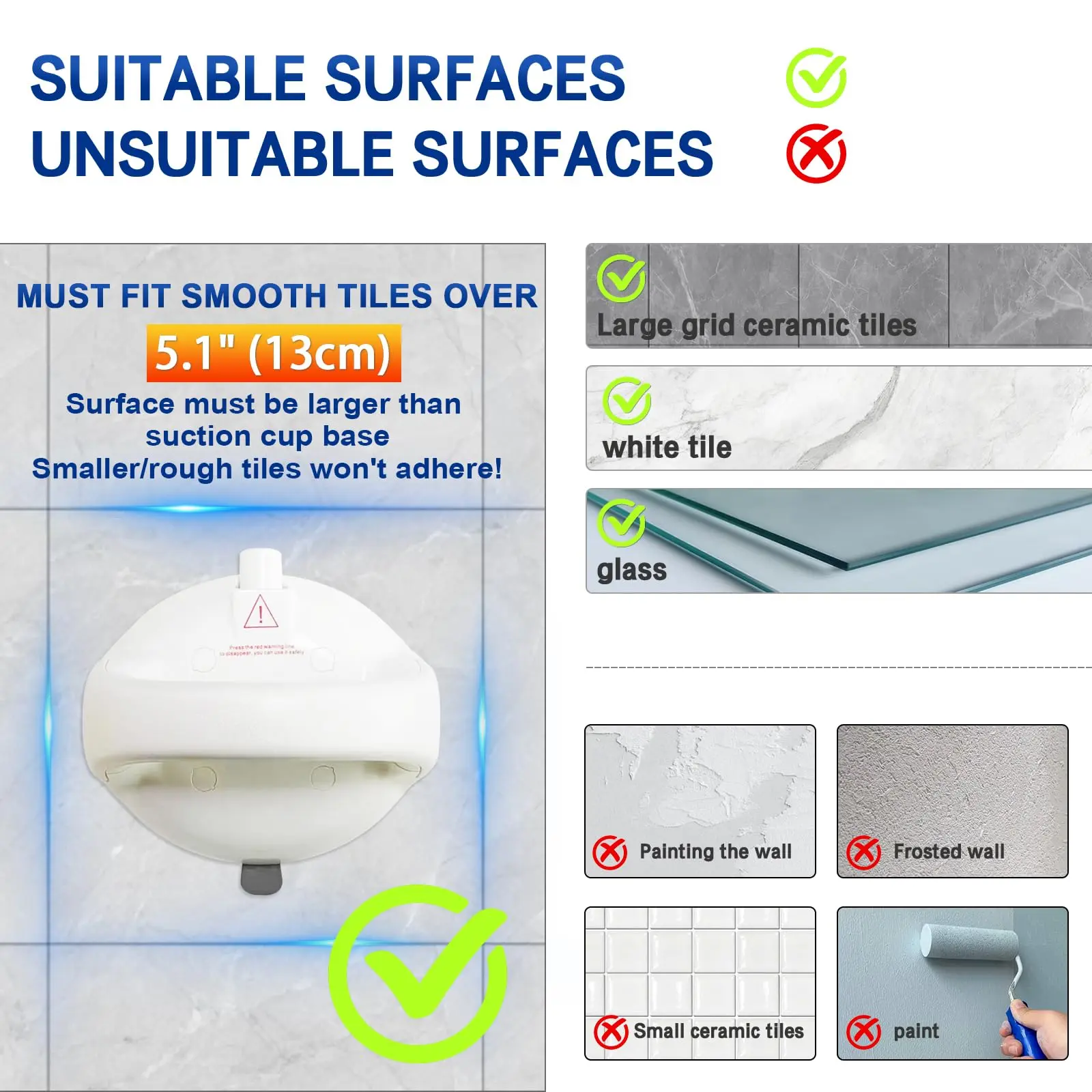 ·【 Important Note 2: Larger than 5.1 Inches 】 The diameter of suction grab bar for shower is 5.1 inches, so tile's diameter must be larger than 5.1 inches. If you have any questions about our suction grab bar for shower, please feel free to contact us.