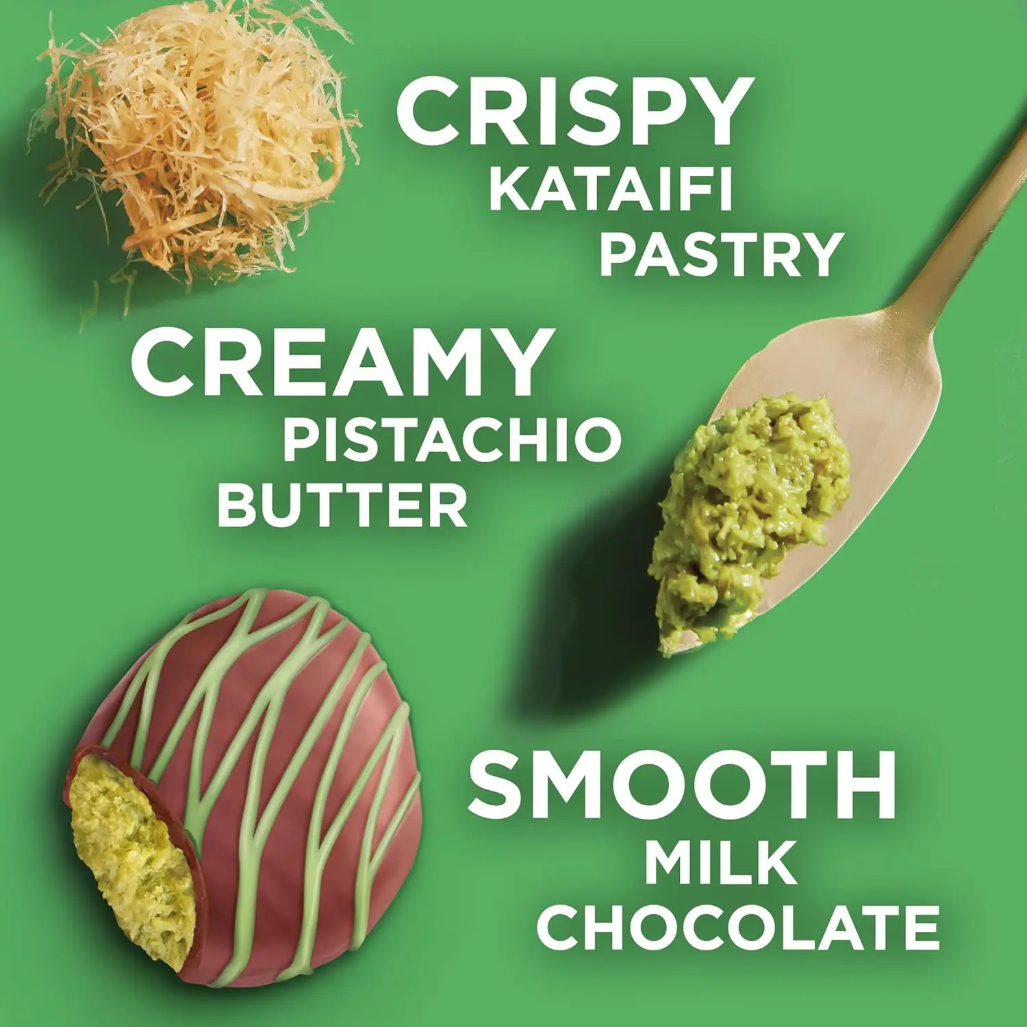·Dubai Style Chocolate is here - experience the flavor sensation everyone is talking about! RUSSELL STOVER has created our version of this viral sensation in a candy bar - giving you more filling for a more satisfying bite! Our RUSSELL STOVER Dubai Style Pistachio & Kataifi in Milk Chocolate Candy Bar, 1.1 oz., combines creamy pistachio butter and crunchy kataifi/kadayif (shredded phyllo dough), plus hints of almond, all covered in smooth milk chocolate for a rich, crunchy bite unlike anything you've tasted before! Taste the candy that's taking the world by storm, from the company that has been making delicious candy fillings for over 100 years. Due to the premium nature of this candy, we recommend chilling until ready to indulge. Made with the finest ingredients, RUSSELL STOVER has been an American classic since 1923. We are proud to be part of your holiday candy traditions and everyday indulgences.