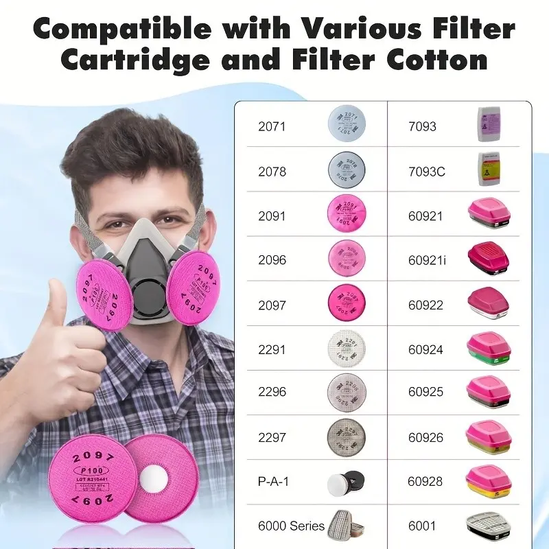 Half Face Respirator Mask Breathe easily no matter where you work The respirator mask can effectively filter /gas, dust, pollen, smoke and other particles to protect our heathy. Soft silicone fit, no irritation, good sealing.