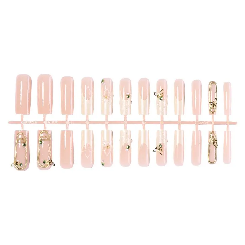 Nude Sheer French Press On Nails, 3D Milky White Shell Texture Carving, Gold Outline Wire, Butterfly & Flower Accents with Green Rhinestones and Pearls, Luxurious Elegant Long Trapezoid Removable False Nails with Jelly Glue and Nail File