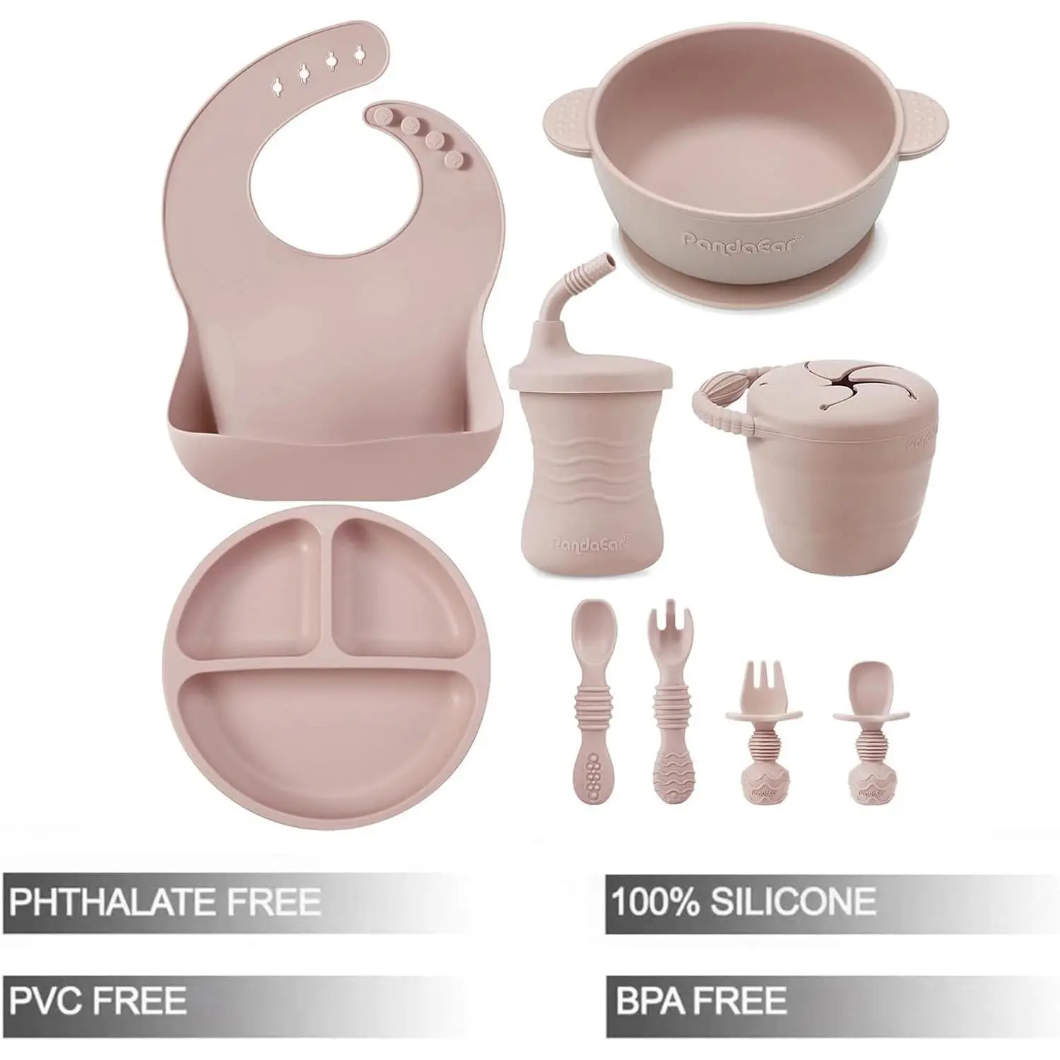 PandaEar Silicone Baby Feeding Set, where safety meets innovation. Our commitment to your baby's well-being is evident in the use of 100% Food Grade Silicone, meeting the rigorous standards of CPSIA Children's Product Approval. This set is not only free from harmful substances like BPA, Phthalates, and PVC but is meticulously crafted with non-toxic, baby-safe materials.Warning: The silicone suction bowl may conform or cling to a baby's face and prevent breathing. Adult supervision is required.