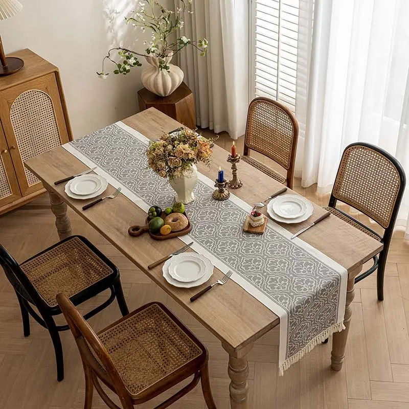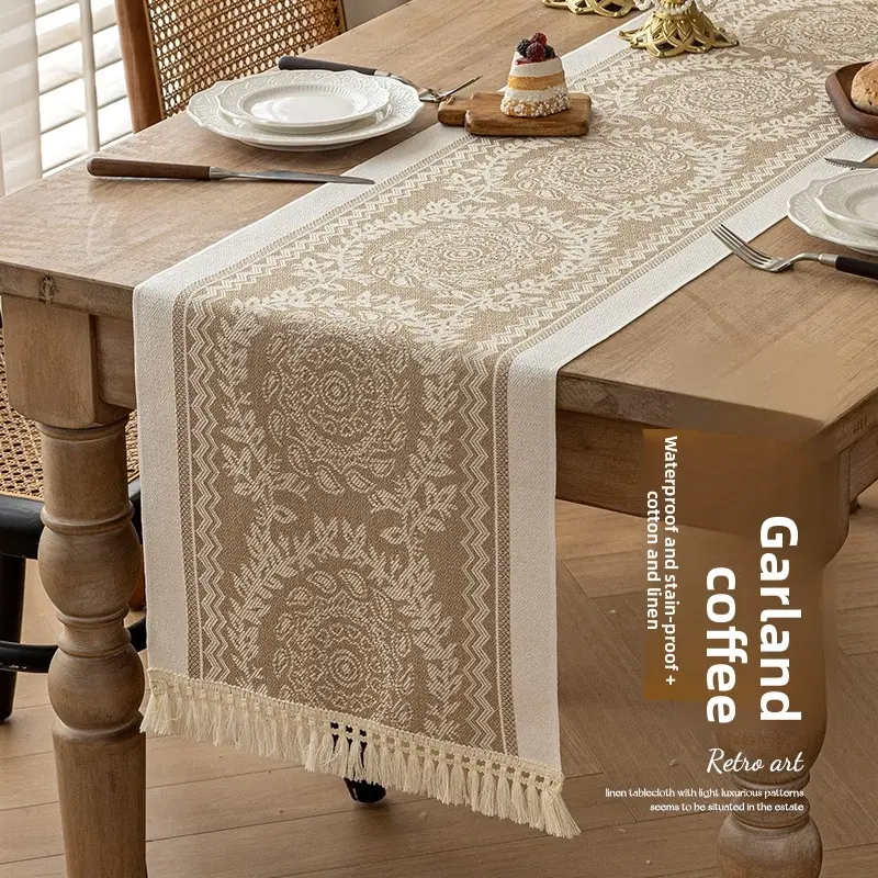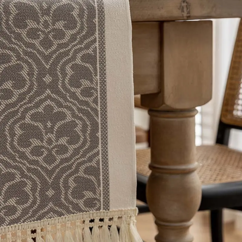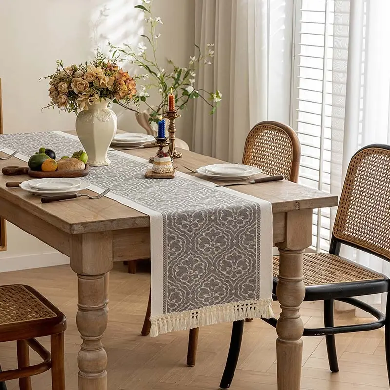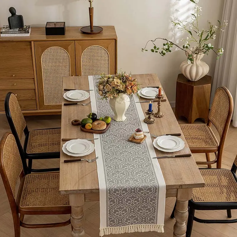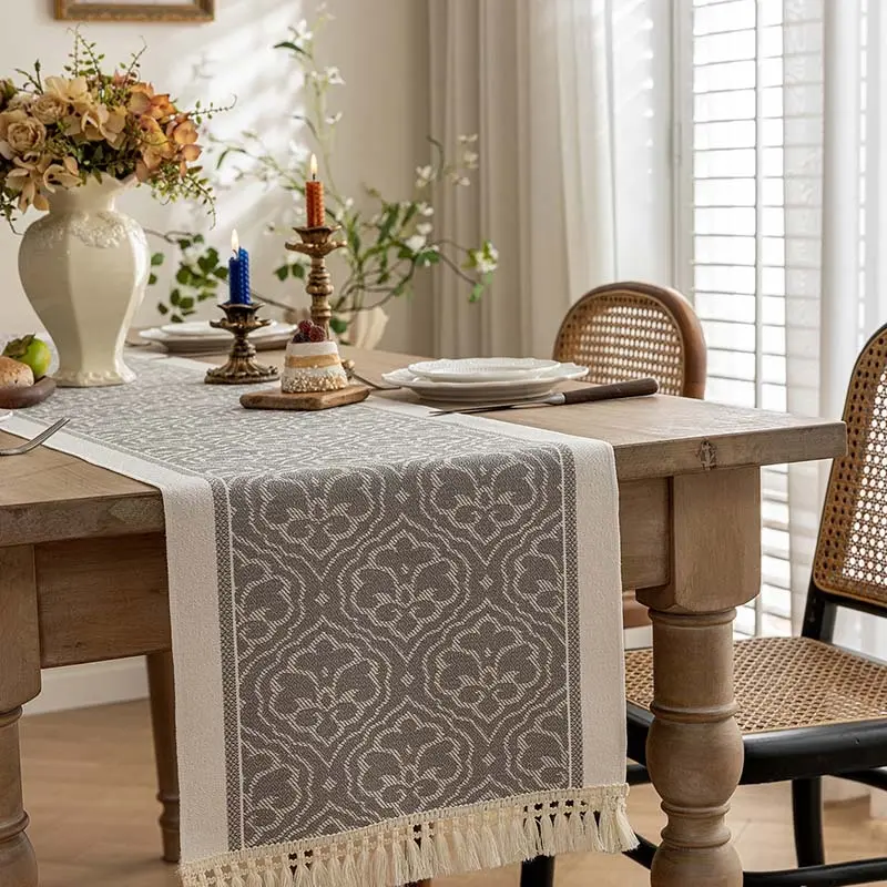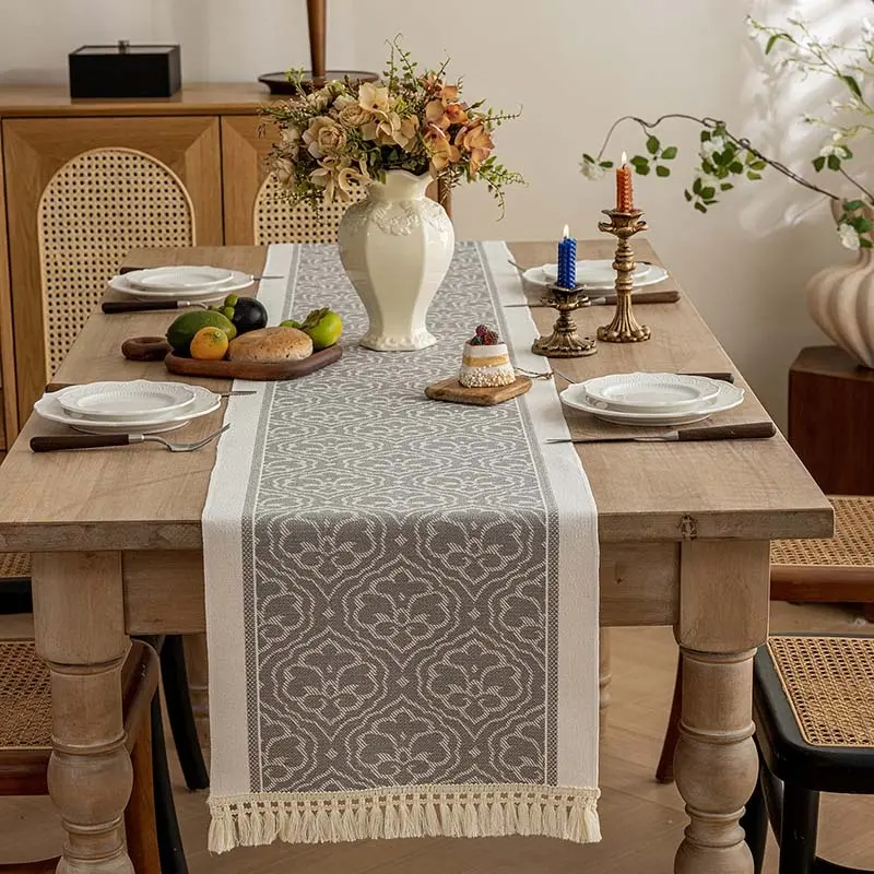 Nordic Style Waterproof Cotton Linen Table Runner, Jacquard Pattern with Tassel Trim, Dining Table Decor